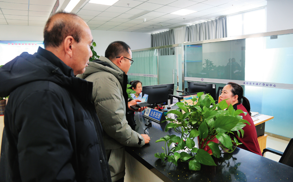 北京市密云区人民法院执行局干警与河北省永清县不动产登记中心工作人员沟通过户事宜(2023 年 12 月 26 日摄) 干潘亭摄
