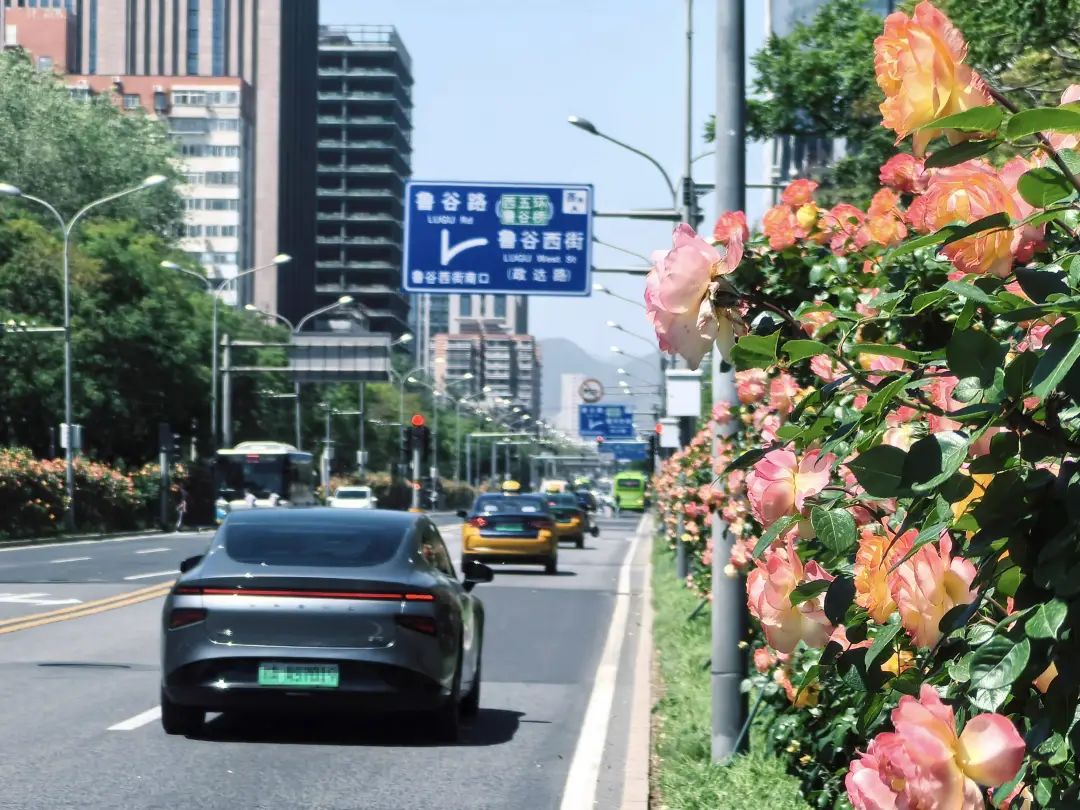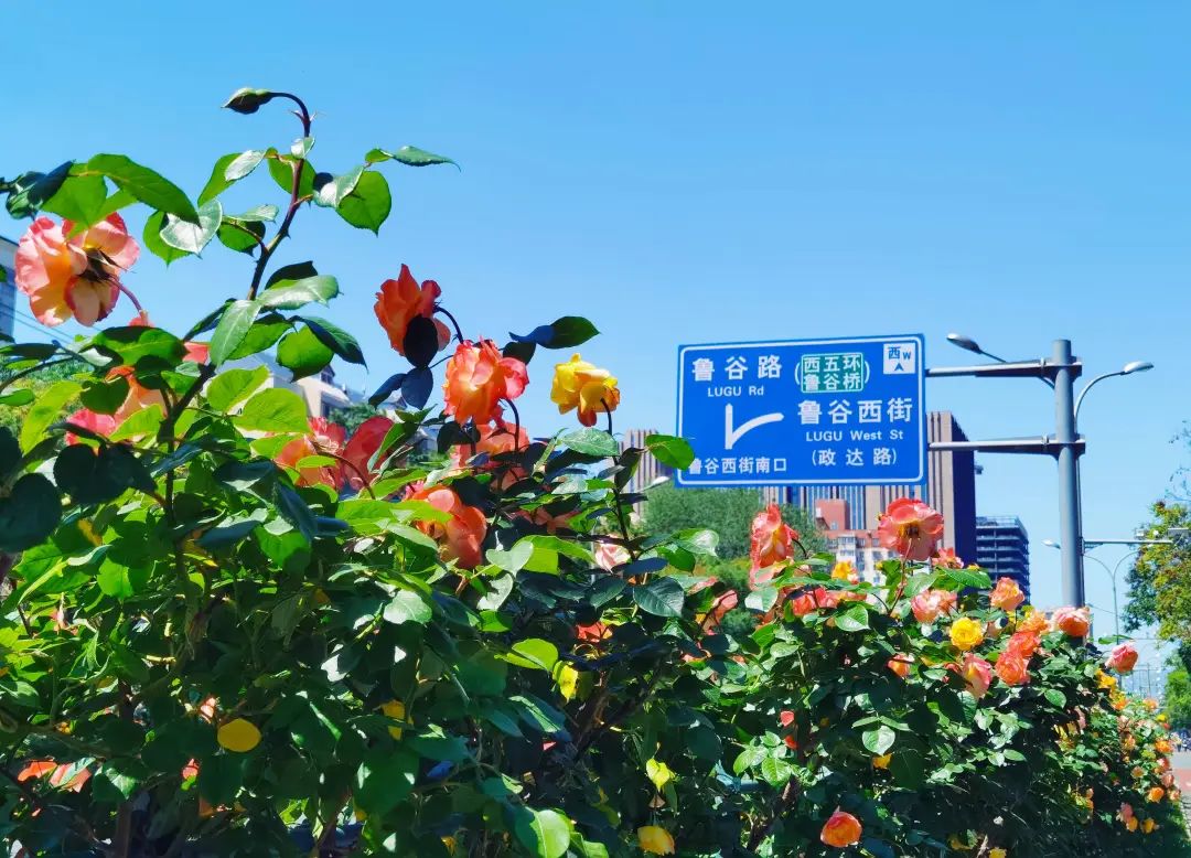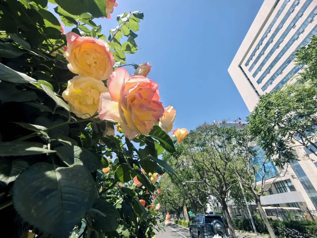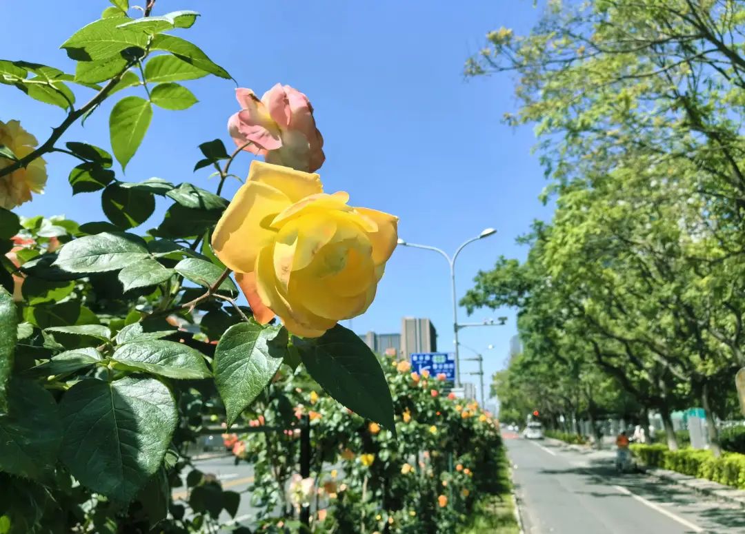 月季四季开花,自然花期为4月至9月,4月下旬至5月中旬,月季进入一年中的第一次盛花期,五彩缤纷,朵朵争艳,吸引着过往市民的目光,为城市街头增添了夏日的气息。