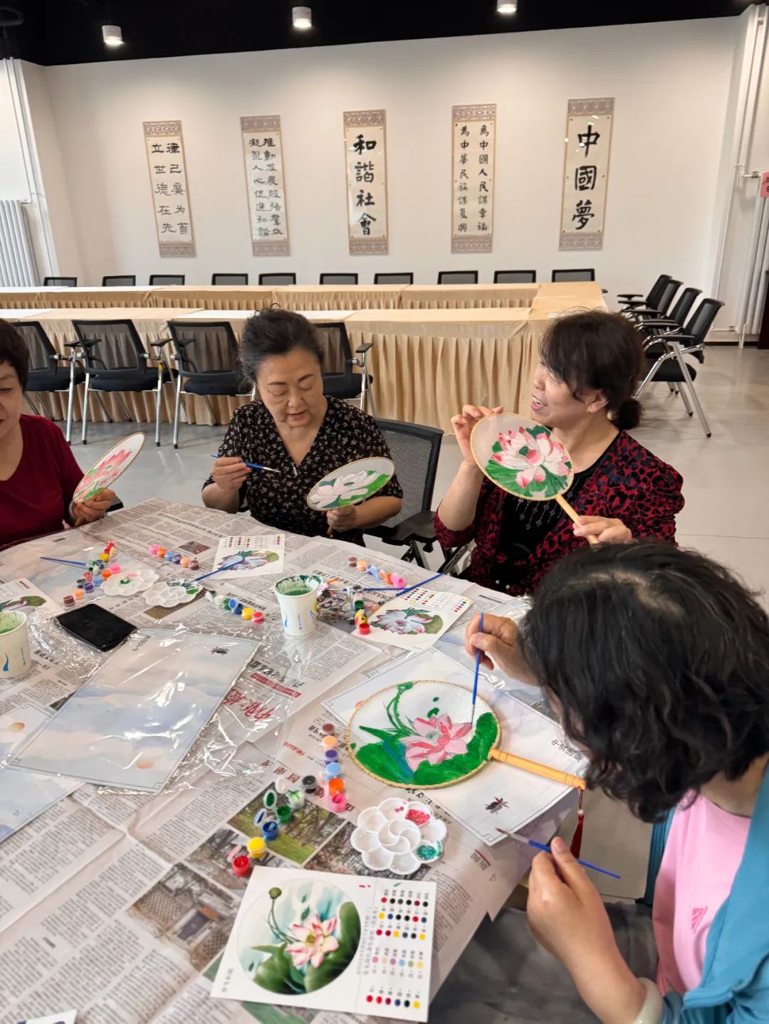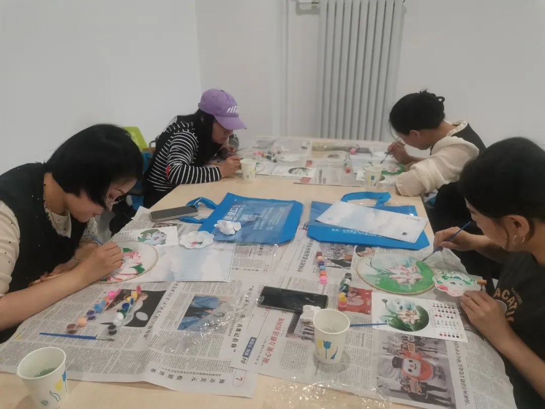 活动开始前工作人员对现场进行了精心布置。活动现场以传统文化为主题,结合现代审美,巧妙融合古朴典雅与现代气息。五彩斑斓的团扇、各式各样的画笔和颜料整齐地摆放在桌面上,为参与活动的职工们提供了一个舒适、宽敞的创作空间。