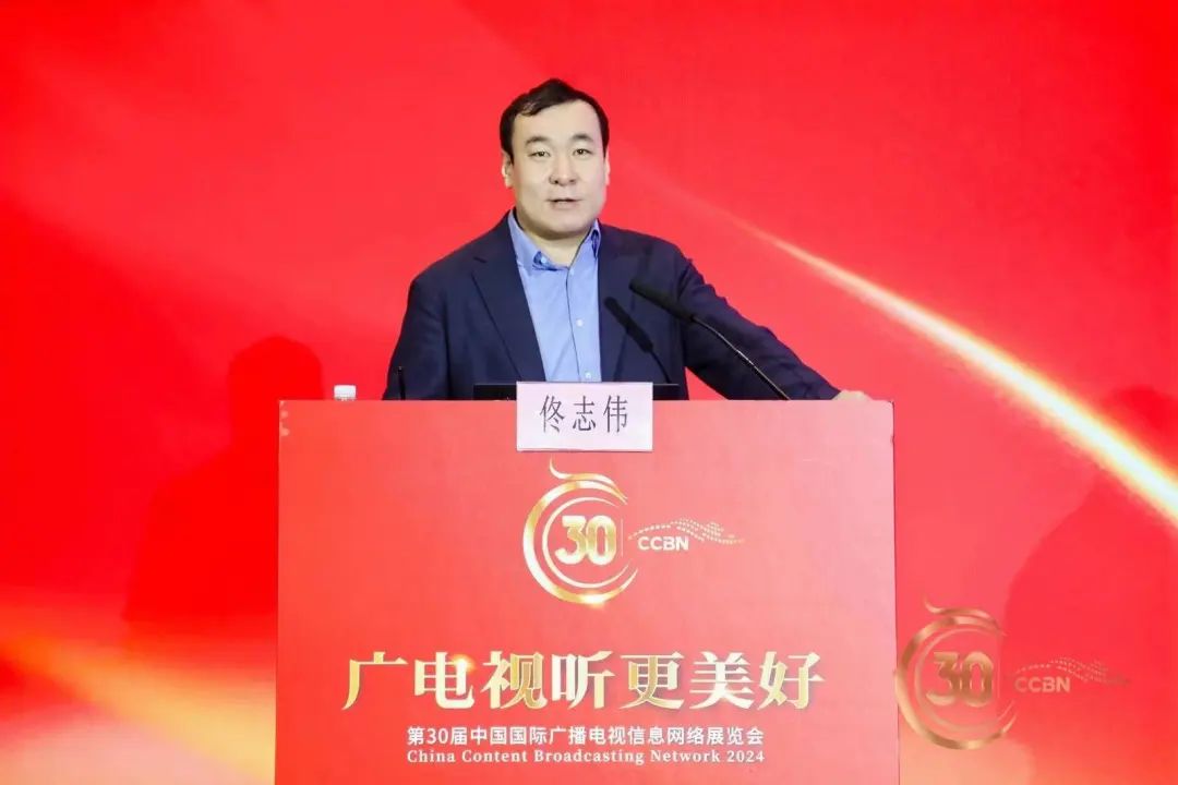 ▲第三十届中国国际广播电视信息网络展览会(CCBN2024)融媒体中心发展创新论坛上,海淀区委宣传部副部长、区融媒体中心主任佟志伟作主题分享