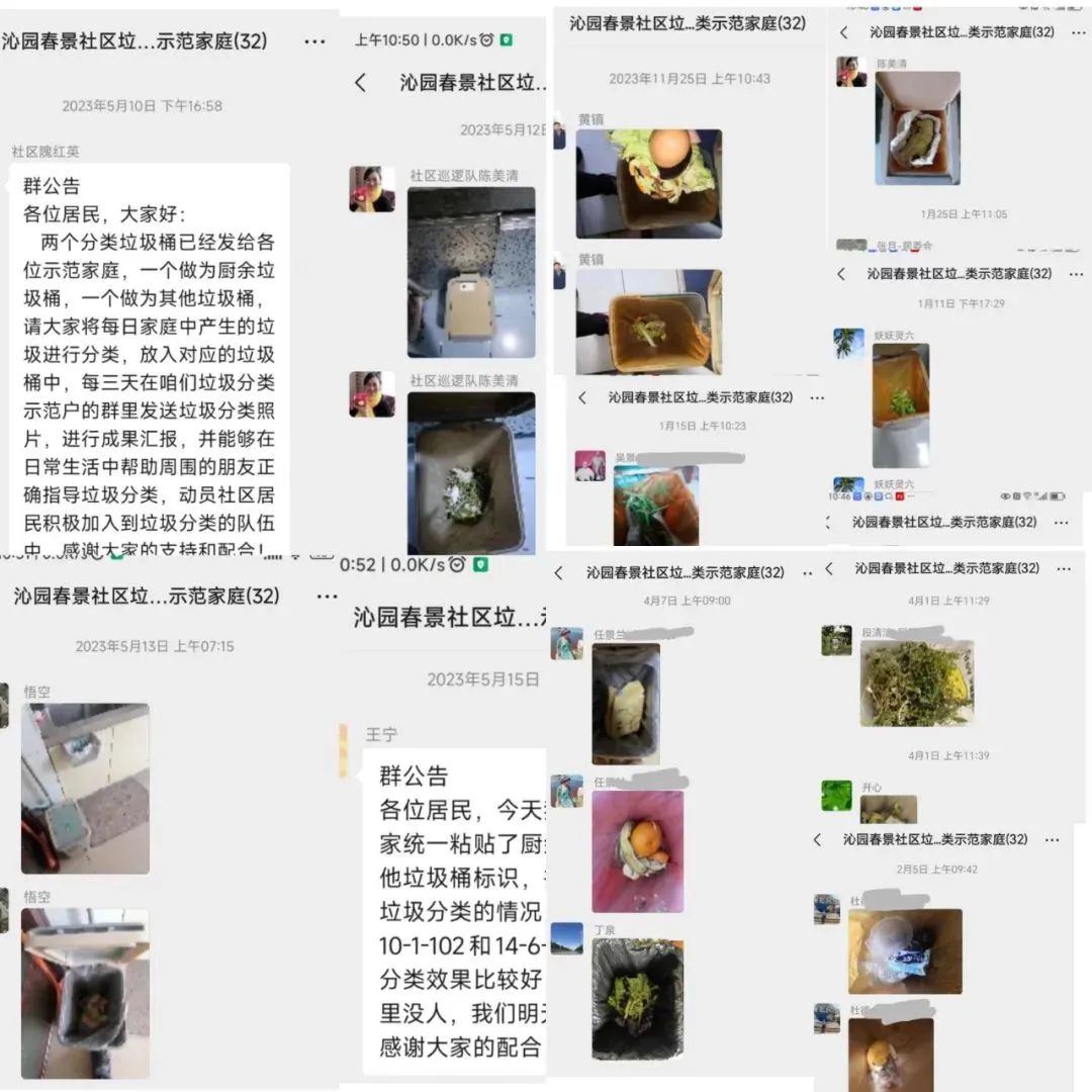 窦店镇沁园春景社区作为第二批北京市垃圾分类示范小区,2023年5月社区党支部、居委会为增强居民垃圾分类意识和低碳环保理念,推选出16户垃圾分类示范家庭,同时组建垃圾分类示范家庭微信群,每个家庭每天一次在微信群里分享垃圾分类照片,这样既给大家提供相互学习交流的平台,又能相互监督、互相促进,垃圾分类指导员发现问题也能及时给予监督和指导。