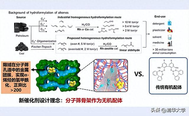 近日,清华大学化学系刘礼晨副教授、清华大学燃烧能源中心/车辆与运载学院张亮副教授领衔的研究团队与中科院山西煤化所/中科合成油曹直研究员合作,成功破解了烯烃多相氢甲酰化反应中选择性的关键难题。通过使用分子筛作为“无机配体”,实现了长链烯烃氢甲酰化反应中超高的区域选择性,超越了几乎目前已报道的所有均相和多相催化剂。该研究不仅突破了多相长链烯烃氢甲酰化反应的选择性瓶颈,还提出了一种新的固体催化剂设计理念,即使用分子筛作为无机配体,实现对金属活性中心配位环境的调控。