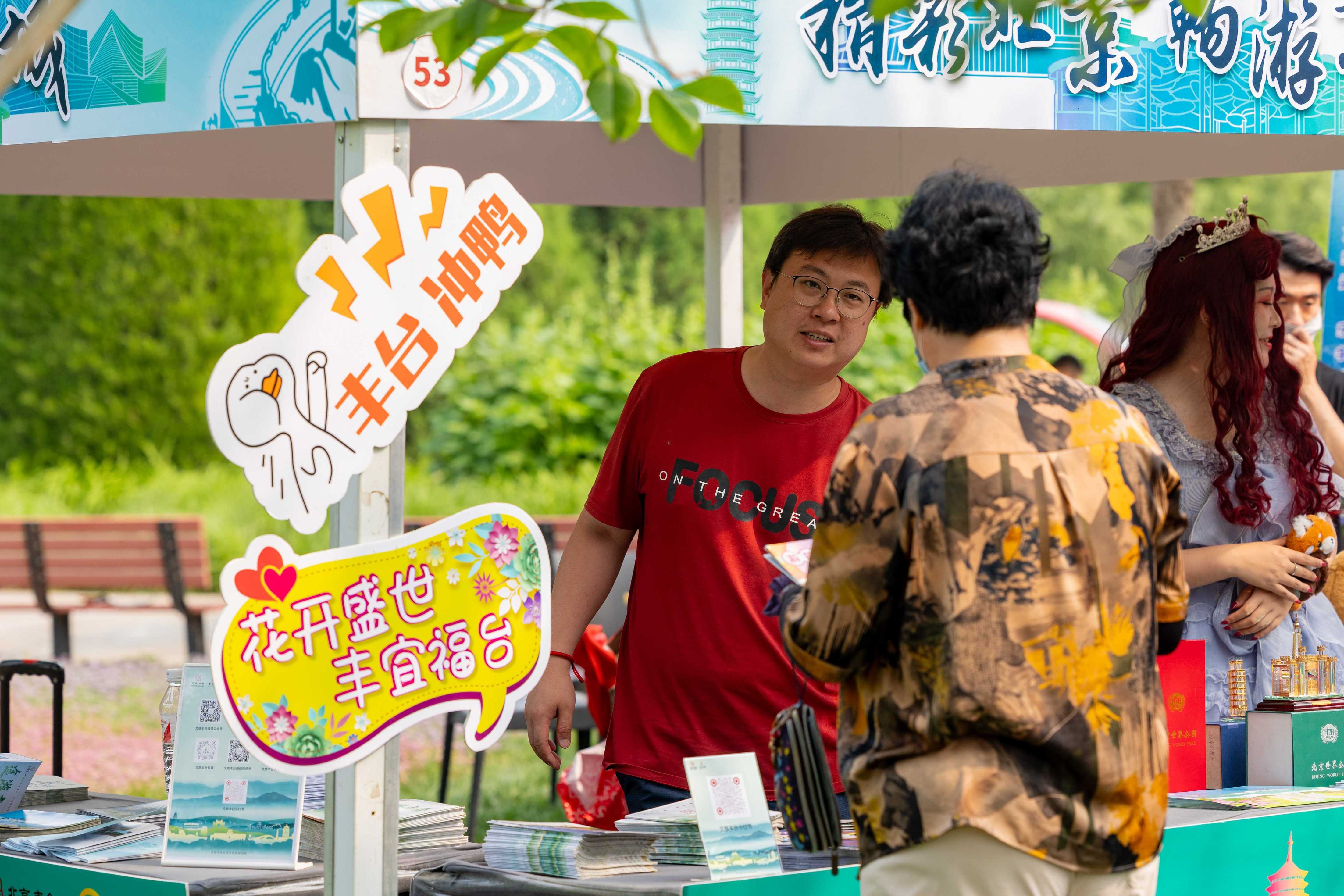 丰台专区的活动也特别热闹,吸引了许多游客前来参观。丰台区文旅局相关负责人表示:“今年是第14个‘5·19中国旅游日’,丰台区非常荣幸再次承接了北京市主会场的任务。丰台专区重点展示了丰台区的旅游企业、农产品和非遗代表,展览内容丰富多样。除此之外,我们还在线下推出了多项惠民举措,特别邀请广大市民朋友来丰台旅游,尽享欢乐。”