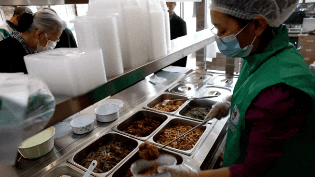 小区周边的老人们陆续走进社区助餐点,有序地排队刷卡打饭。居民包奶奶点了果仁菠菜、干炸素丸子、宫保鸡丁再配上米饭,午饭相当丰盛。她表示这里的饭菜经济实惠,口味也好,不少居民把它当做了自家的“食堂”。