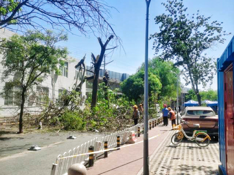 经相关部门审批并取得树木砍伐许可证后,第二天一大早,社区党委全程负责交通疏导以及相关解释工作,北京供电段及专业施工单位现场处置树木,大家分工明确,各司其职。仅用一上午时间,五棵枯树全部移除完毕,彻底消除安全隐患。围观居民纷纷表示:金二社区办了一件好事,昨天刚有树被吹倒,今天就把其它隐患消除了,以后出行的时候就不怕有危险了。