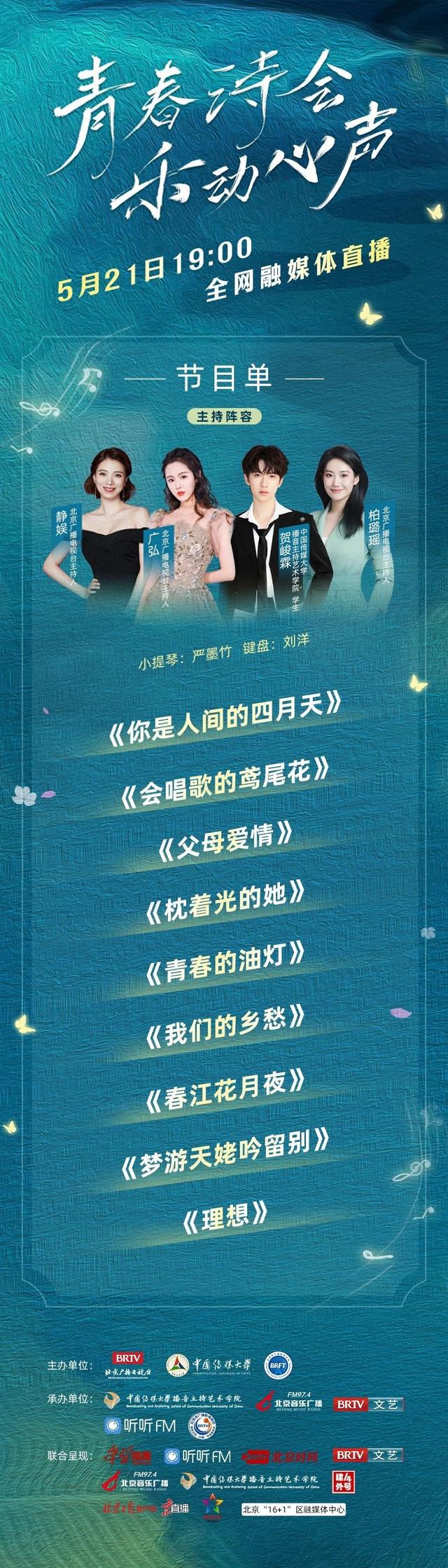 五月的梦,与青春有关! 《青春诗会·乐动心声》将于5月21日19:00,全网直播!诗乐交融,名家新秀,一起开启青春的斑斓梦境~!主持阵容:静娱、广弘、贺峻霖、柏璐瑶!