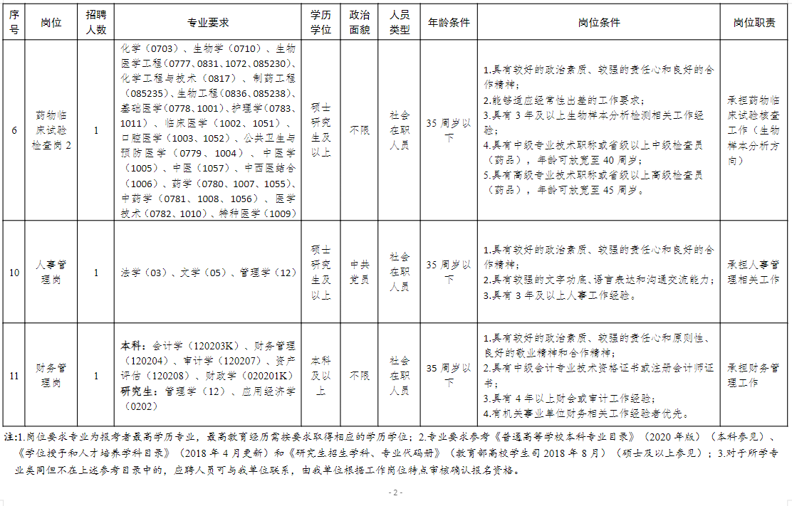 信息技术与数据管理岗、医疗器械临床试验检查岗、药物临床试验检查岗2、人事管理岗、财务管理岗。