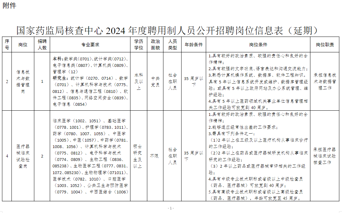 国家药监局核查中心2024年度聘用制人员公开招聘岗位信息表(延期)