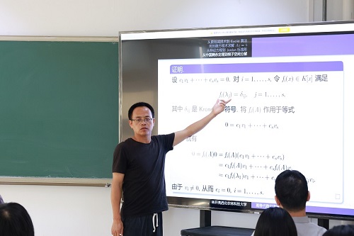 林开亮在本次讲座中以从更相减损术到Euclid算法、用刘徽方程术求解Ax=""b、从特征方程到Jordan标准型以及从中国剩余定理到根子空间分解四个方面讲解了高等代数与我国古代数学的联系。林开亮用简洁精炼的语言和贯穿古今的例题对Euclid算法、中国剩余定理等内容进行阐述,并与师生分享了求解Jordan标准型问题的新算法——从(xIn-A)的列变换矩阵求A的标准型基底。他指出深入理解中国古代数学算法化这一特点,可以启发我们得到高等代数中相关内容的更为高效的算法。林开亮为师生们讲授了一节既生动又新颖的高等代数课,启发了数科院师生对高等代数与中国古代数学之间联系的新思考。