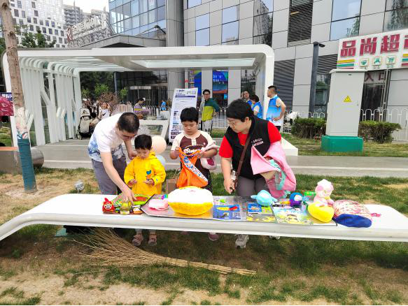 金域华府社区则是结合1818街区快闪活动,在龙域中心B座芯动龙域广场开展垃圾分类跳蚤市场及宣传活动。活动现场,社区工作人员引导孩子们把自己的旧书籍、文化用品、玩具布偶等拿到跳蚤市场展示、交换和自由买卖,促进资源重复利用,减少垃圾对环境造成的伤害。孩子们兴奋地穿梭在各家“商铺”之间,精心挑选自己喜欢的商品。同时,社区工作人员向在场居民发放垃圾分类倡议书,倡导大家积极参与垃圾分类行动。