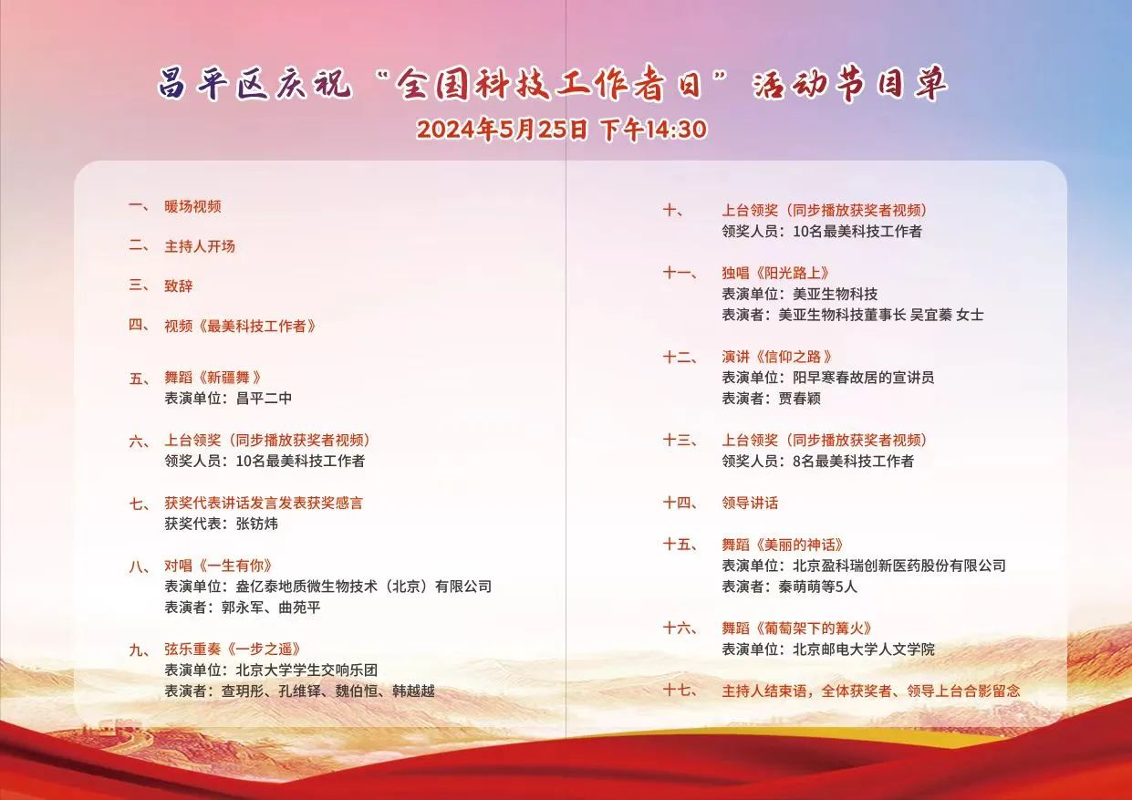 活动现场将播放致敬科技工作者的视频影片《最美科技工作者》,并对28名最美科技工作者进行现场颁奖。此外,活动中您将看到昌平各单位、学校带来的精彩歌舞表演。
