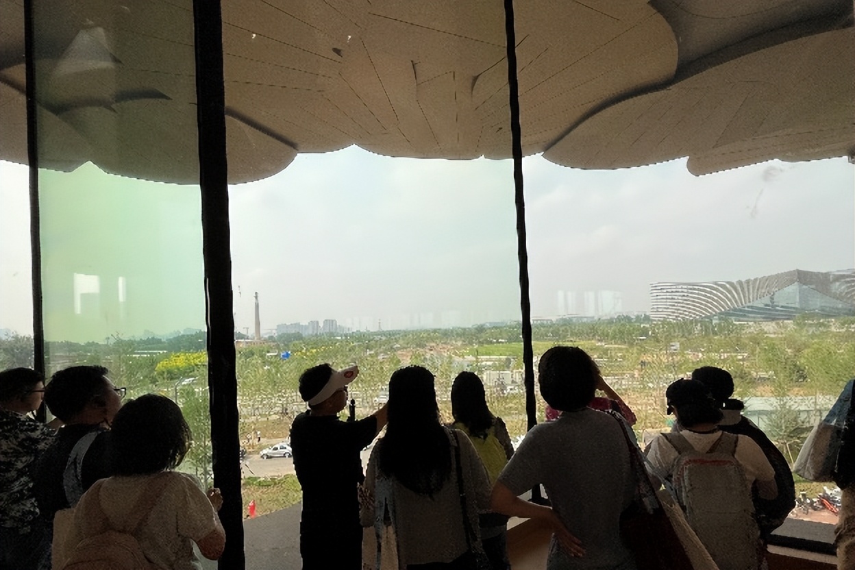 大家首先来到的是北京艺术中心,这是一座设计前卫、造型独特的建筑,其外观设计灵感源自古运河粮仓。在二层观景平台上,于润东向大家阐述了城市副中心的规划理念与三大建筑“化整为零”的空间布局。“我们现在所在的位置在通州副中心的整体规划中是一轴一带交汇处的东南象限,而三大建筑则形成了副中心规划的一个空间锚点,同时我们身后就是北运河,曾经千年流淌的大运河,就从我们脚下的这片土地穿过”,结合图片资料,于润东将时间与空间相融合的规划设计理念向大家娓娓道来。