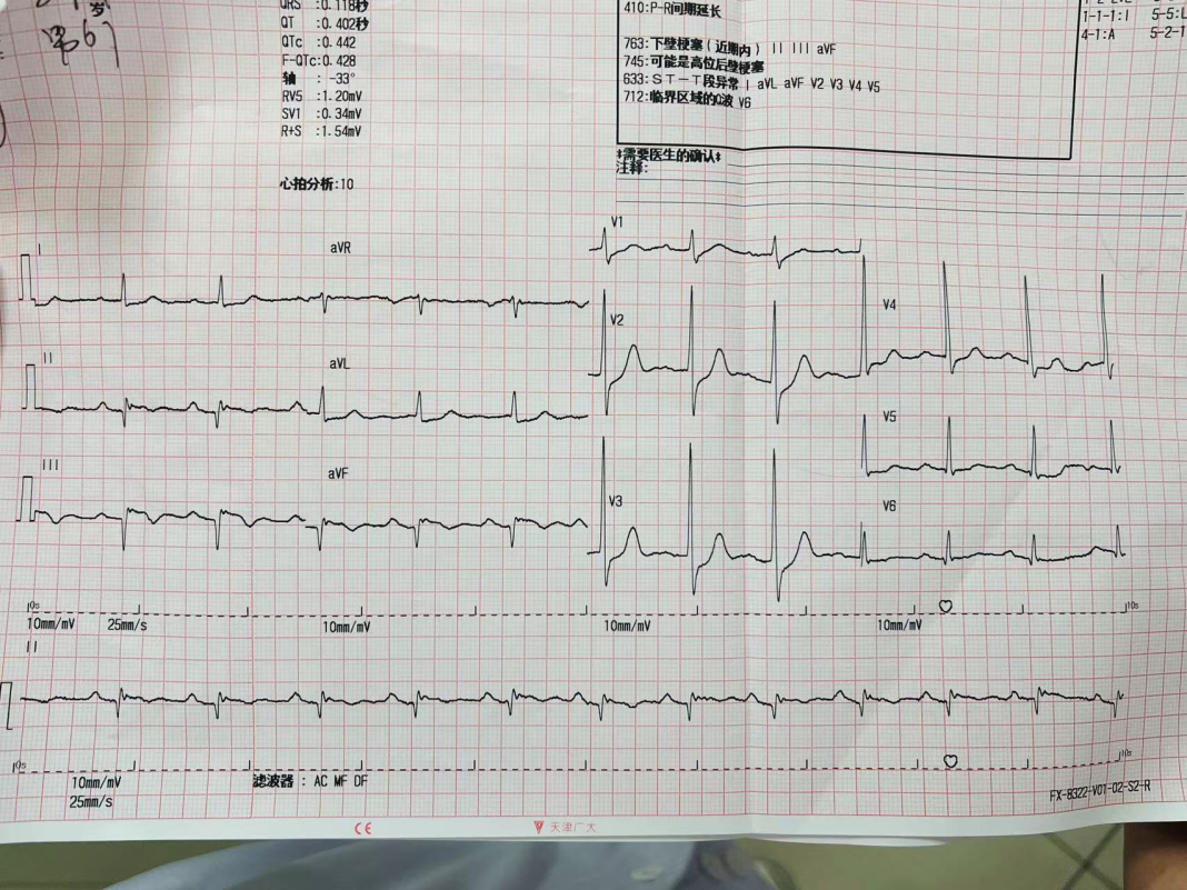 待所有电极安放完毕,心电图机屏幕上的图形一出来就让郭豫医生瞬间想到“急性下壁心梗伴心肌损伤”,但为了避免引起刘先生的紧张情绪而加重病情,她镇静地把图打印出来,让他保持平卧休息,侧身跟家属小声交代:“他的病情有点重,需要通知接诊的家庭医生郭丽敏来确认一下”。