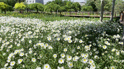 大滨菊附近还有白色风车,让人仿佛走进宫崎骏式的夏天。