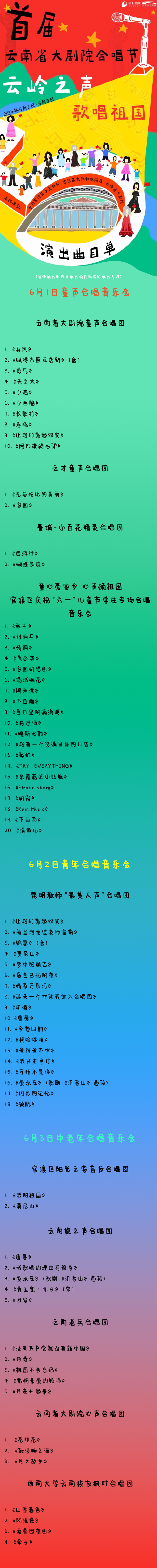 经过两个月紧锣密鼓的筹备,“云岭之声·歌唱祖国”云南省大剧院首届合唱节前期筹备完毕,确定将于6月1日—3日正式举办。