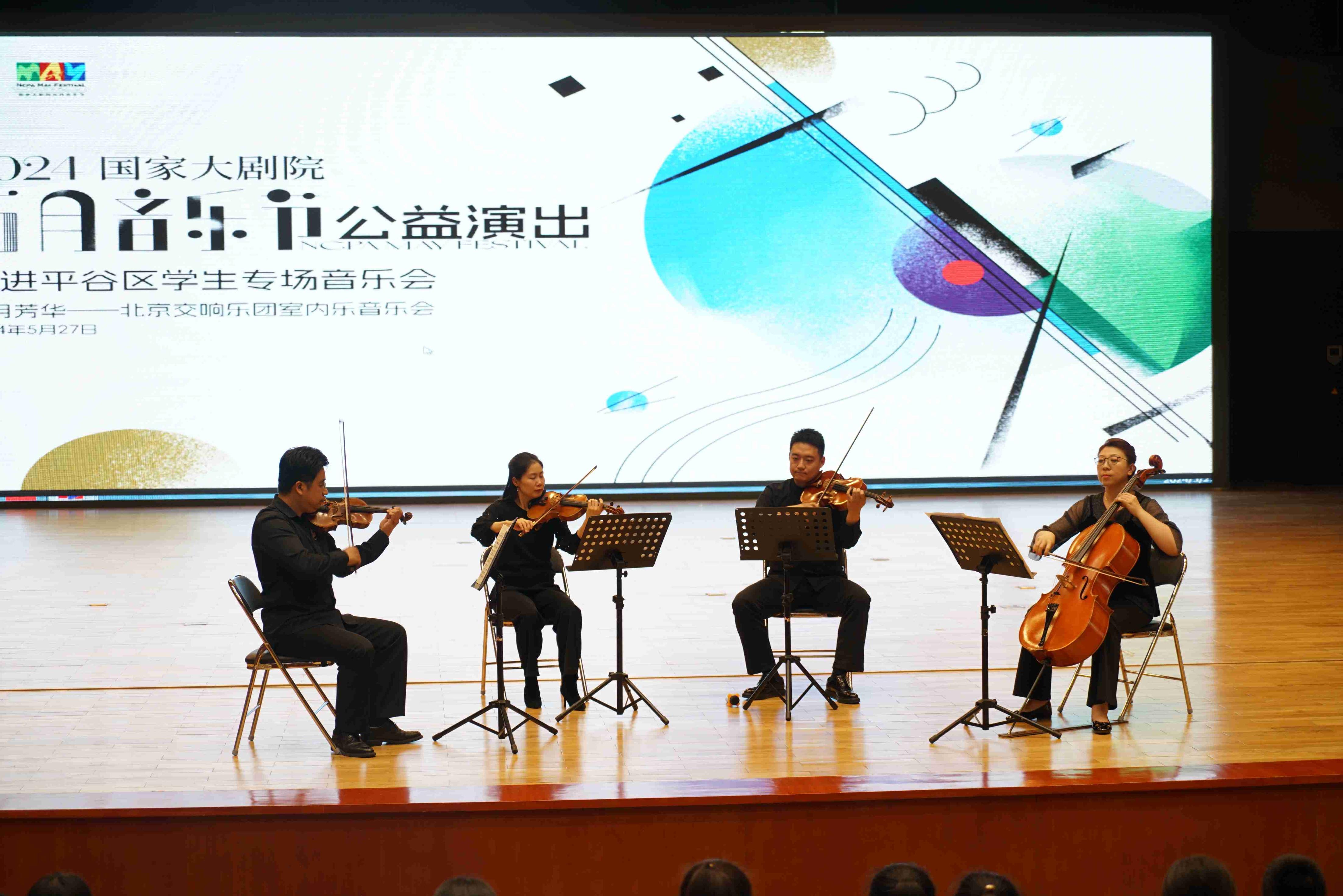 国家大剧院致力于推动远郊区学校美育浸润行动,用美育之光点亮远郊区中小学生的艺术梦想。本次演出中,齐志鑫、雷迪、董霖崧、李阿晶四位来自北京交响乐团的四重奏艺术家为现场观众带来了《G大调弦乐小夜曲K.525 第一乐章》《多瑙河之波圆舞曲》《庆丰收》等9首经典曲目,让人沉醉其中。