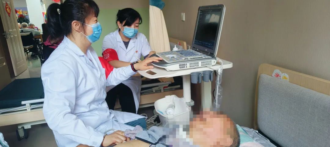 在照料中心工作人员有序的安排下,医护志愿者们为老人们进行了生化检验、心电图、B超、血压测量等项目的体检。由于老人们大多数行动不便或卧床,医疗队员分工合作,悉心忙碌在老人们的身边,这份默默而饱满的体贴与关爱充满了照料中心。