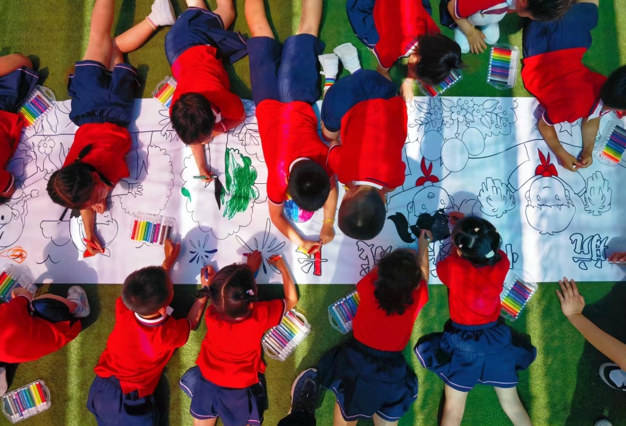 “看!我画的小裙子多漂亮!”“我画的是祖国的花朵”“我们就是祖国的花朵”......孩子们用手中的画笔在长卷上展示了一个充满童心、童真、童趣的儿童艺术世界。一幅幅富有童心童趣、色彩斑斓的画面,汇聚成一幅承载着孩子们对美好生活感受与梦想的画卷。