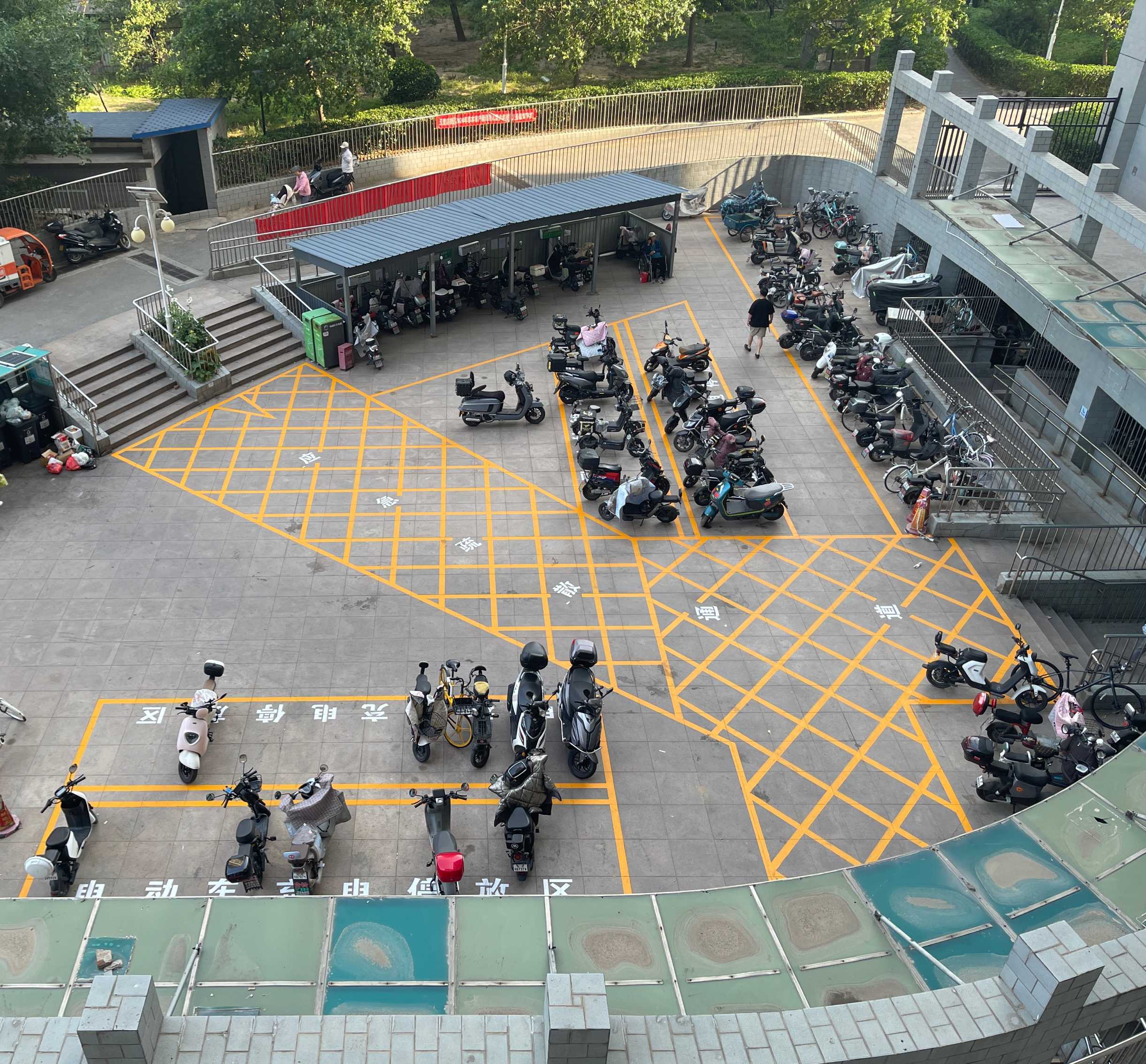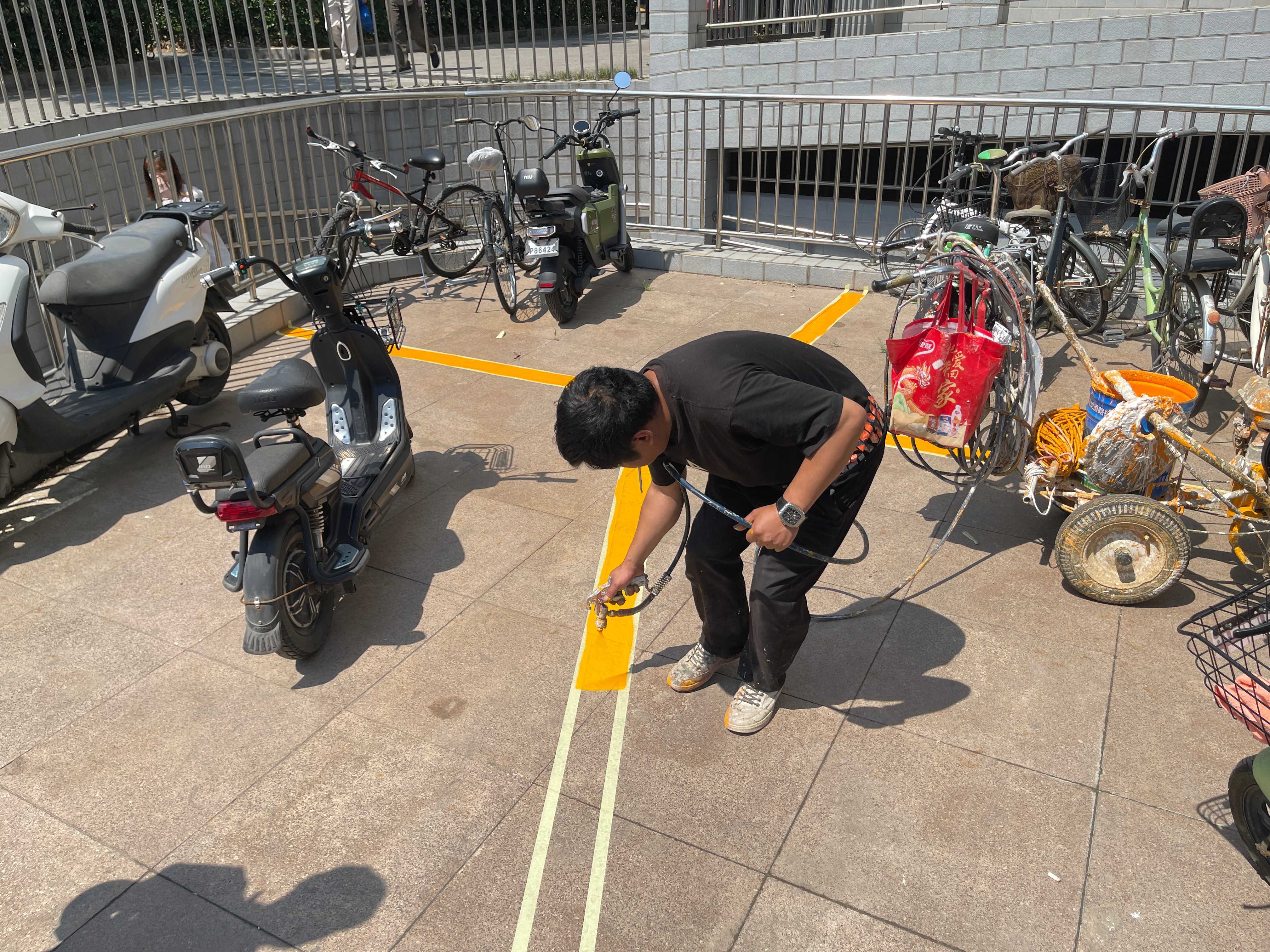 不到3天的时间,2处下沉广场和4处楼前区域全部规划完毕。下沉广场被整齐地分割成不同的功能区,包括消防通道的“禁停区”、电动车充电区、电动车停放区以及摩托车停放区,满足居民的不同需求的同时,进一步减少了安全隐患。