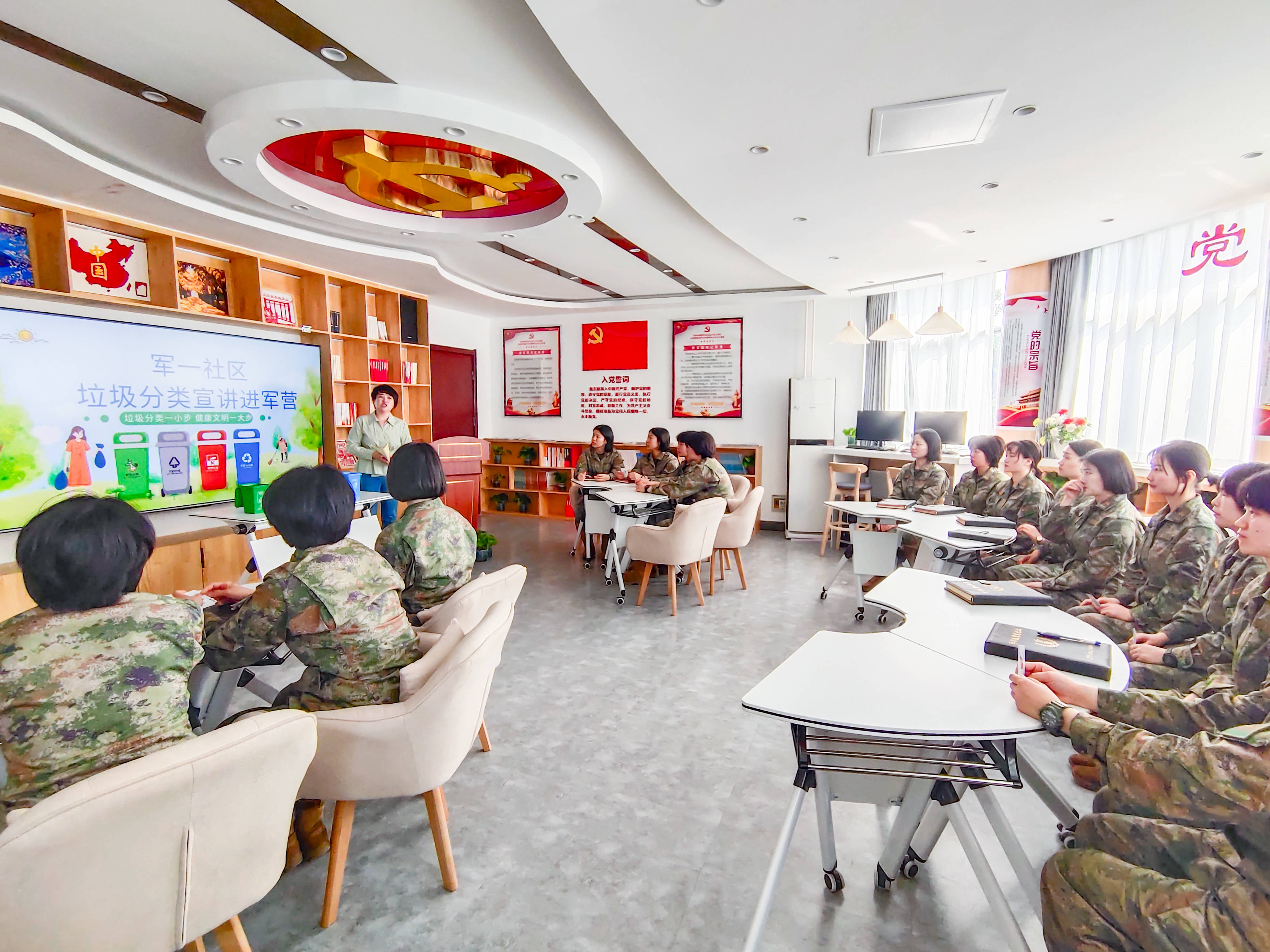 活动现场,社区工作人员将宣传手册发放到部队官兵手中,并结合部队实际情况,为大家详细讲解了垃圾分类的知识、各类垃圾的投放方式以及在生活中如何做好垃圾减量的方法,引导大家从部队环境、个人习惯、文明投放的角度,学习处理垃圾分类。