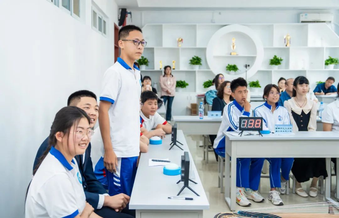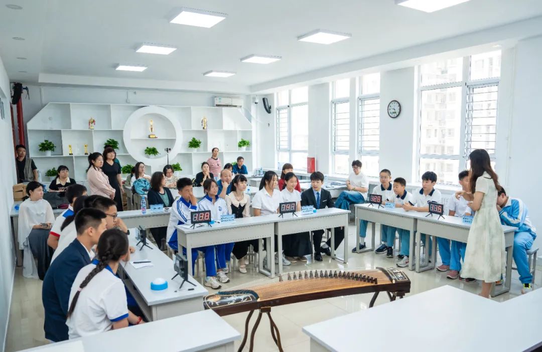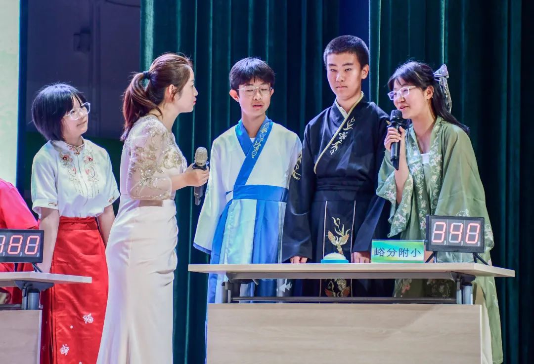赛场上,小学组参赛队员身着汉服,尽显雅韵;初中组参赛队员则以古筝为伴,诗乐交融。