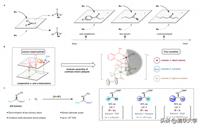 近日,清华大学化学系刘强课题组在手性识别与不对称催化研究领域取得新进展,通过设计并构建一类具有精细可调限域结构的阴离子型锰氢催化活性中间体,在酮亚胺化合物的不对称氢化反应中成功实现了对微小差异烷基取代基之间的精准手性识别。