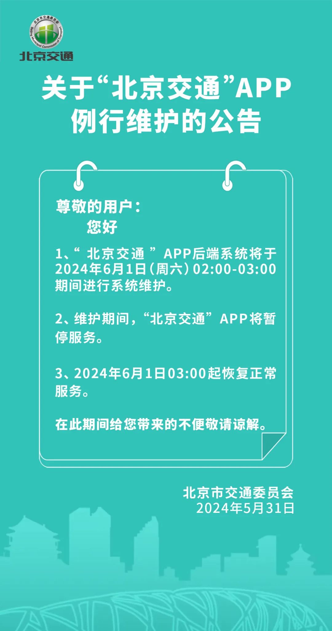 您好,“北京交通”APP后端系统将于2024年6月1日(周六)02:00-03:00期间进行系统维护。维护期间,“北京交通”APP将暂停服务,2024年6月1日03:00起恢复正常服务,在此期间给您带来的不便敬请谅解。