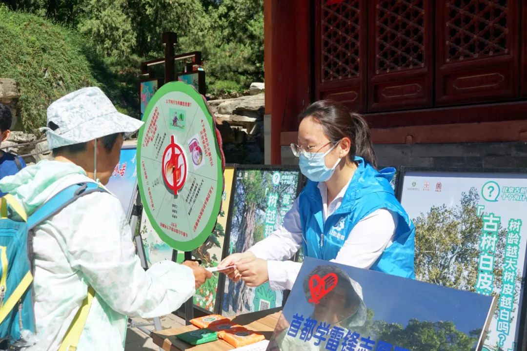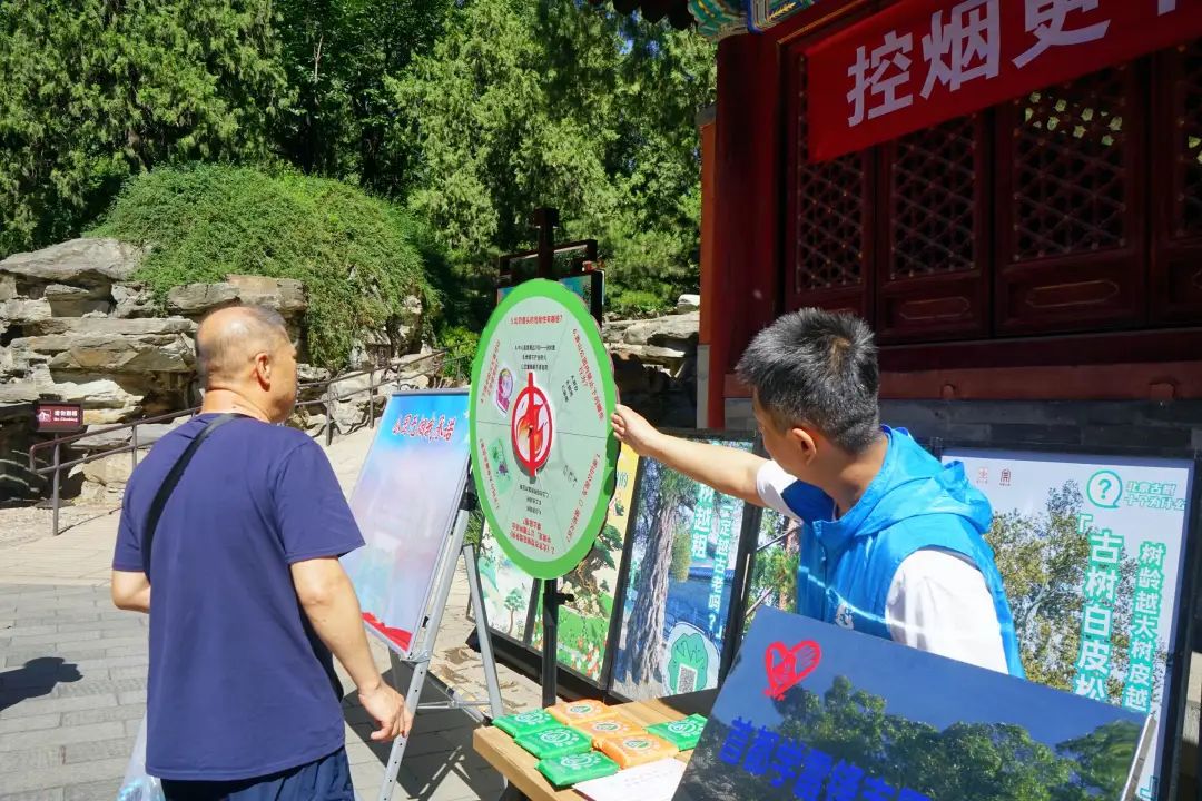 现场设置宣传展板,为游客解读《北京市控制吸烟条例》,分析烟草的危害,并开展知识问答转盘挑战,游客纷纷驻足参与,在互动体验中了解吸烟的危害和控烟的重要意义。