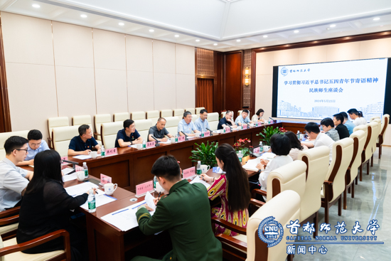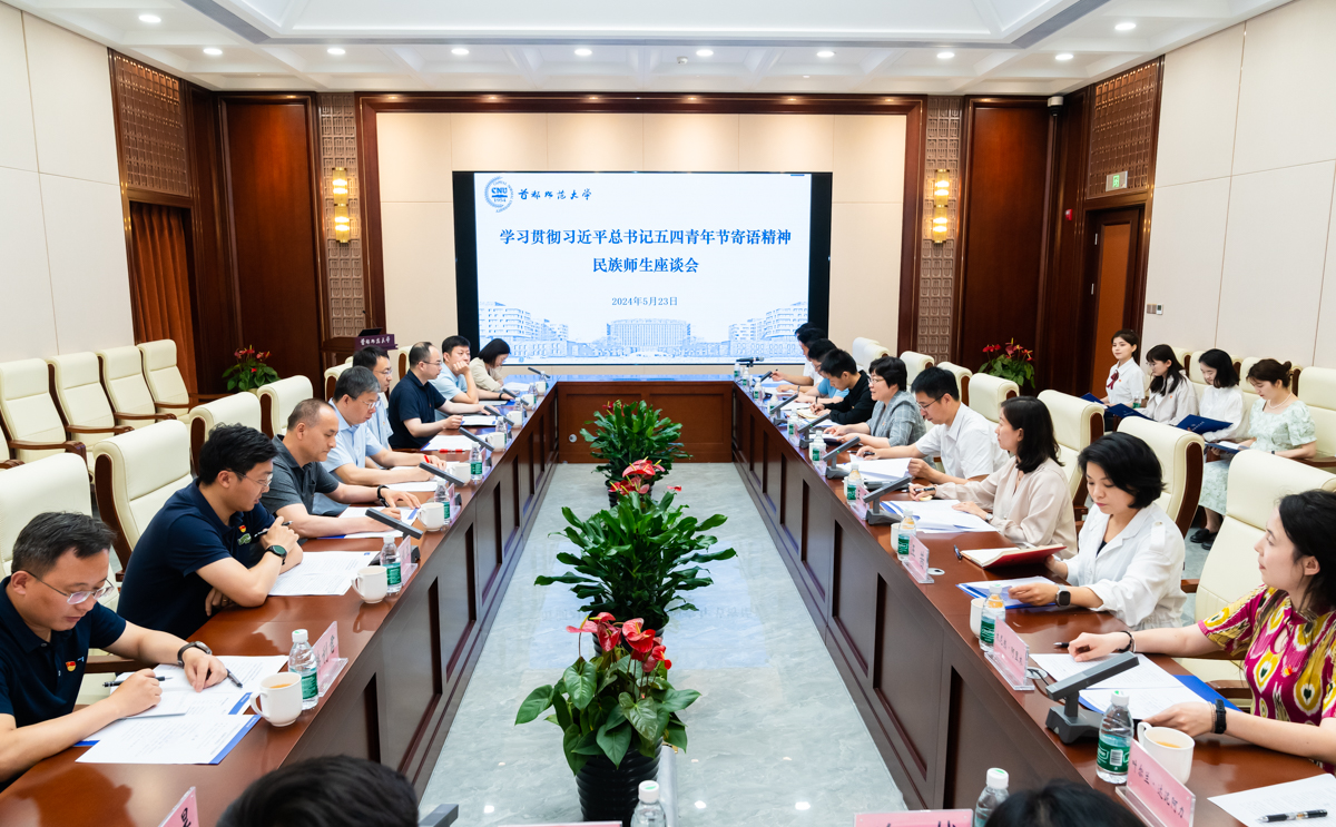 会前,首都师范大学校长方复全院士在书中洞天贵宾室会见了来宾。他代表学校对荆德刚、胡炜一行莅临学校调研指导表示热烈欢迎。座谈会上,孙晓峰结合习近平总书记五四青年节寄语精神和习近平总书记对学校教育援疆工作的重要批示,详细介绍了学校的整体发展情况以及民族学生教育工作的进展。她指出,学校党委始终高度重视民族学生教育工作,并用“六个最”总结了近年来学校在铸牢中华民族共同体意识和推进民族学生教育等方面的特色做法和显著成效。她表示,学校将依托自身优势和特色,继续坚持用心用情做好民族学生教育培养工作。
