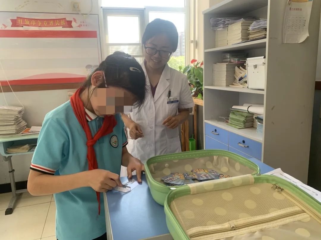 “在遥远的神话时代,有一个被称为‘药王谷’的神奇之地……”随着故事的展开,医务人员和小学生们来到了中医药文化之旅的第一站——快乐心情魔法箱。同学们将自己的坏情绪写在卡纸上,投到“情绪粉碎机”中粉碎,再抽取一张“快乐秘方”刮刮卡,向大家分享让自己快乐的“咒语”。“同学你看,你的坏心情在一点一点地被粉碎,现在是不是开心多啦?”保健科医生唐艳鹏温柔地对同学们说。