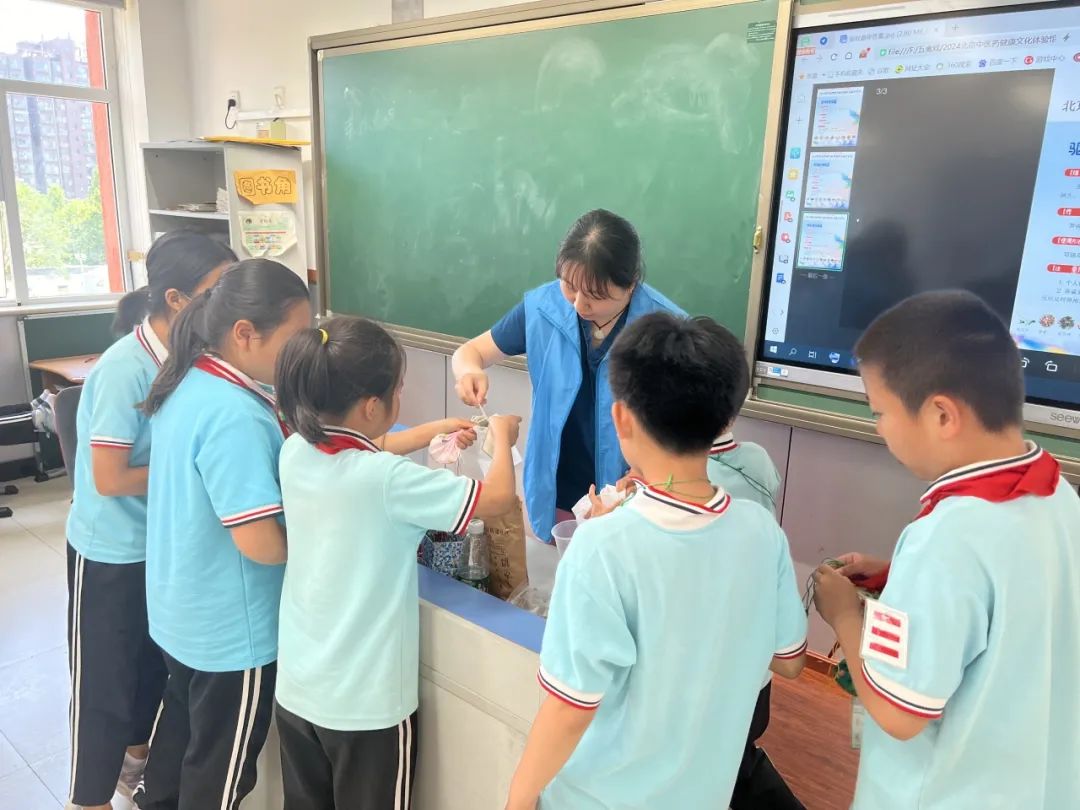 “哇,好漂亮!”是什么引起了同学们的欢呼?原来是到了“香囊快乐之旅”的环节,每位同学都可以亲自做一个香囊。现场有三种香囊供选择,它们有不同的功效,分别是驱蚊避秽、安神助眠、醒脑解郁,另配有祝福卡片。同学们迫不及待地放药粉、装香囊、写祝福,医务人员在旁边指导和帮助他们,“阿姨,我这个香囊肯定是醒脑的,我闻了一下立马就不困了”,一名小男生开心地说。