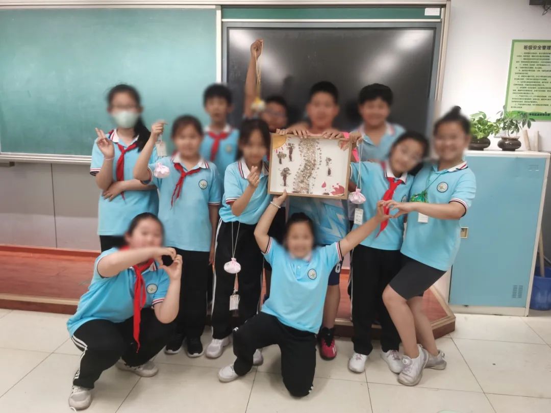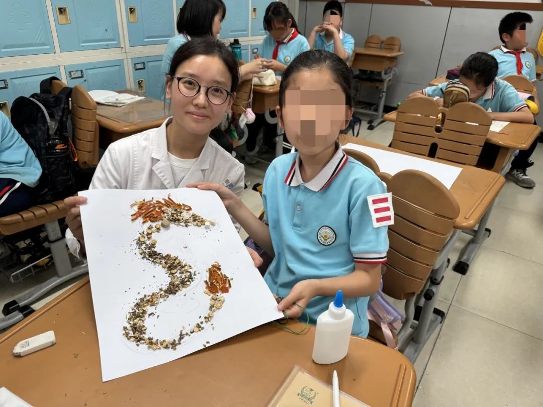 为了让同学们对中草药有更直观的认识,更好地发挥自己的想象力、创造力和团队协作精神,“快乐本草创意画”环节便诞生了。同学们分组进行,每组一袋中草药,将这些中药材作为艺术素材,通过绘画、粘贴等,完成了一幅幅富有创意的美术作品,并开心地与作品合影留念。