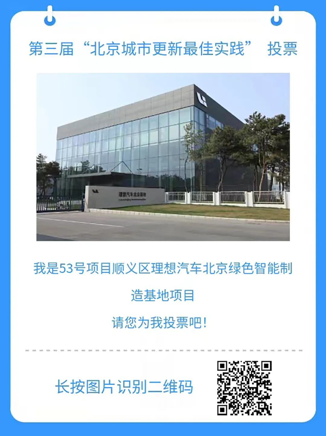 项目前身为北京现代一厂。理想汽车以“零碳工厂,绿色标杆”为目标,通过城市更新拓展产业空间,对原有闲置厂房改造升级,打造成为理想汽车新能源制造基地。项目由顺义区属国有企业北京顺义科技创新集团有限公司和北京理想汽车有限公司合作共建,政企合作降本增效,极大缩短了项目建设周期。作为“工”改“工”的城市更新典型案例、北京市“十四五”时期重点布局的新能源汽车智能制造项目之一,项目实现了以产业升级为核心的城市有机更新,助力区域经济高质量发展。