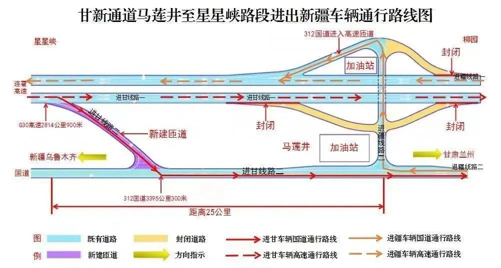 据悉,路段改造期间, 由新疆至甘肃的车辆可沿G30高速公路由西向东途经“甘肃柳园”主线收费站全程高速通行;沿G30高速公路由西向东行驶至2814公里900米处时,向右驶入新建匝道,驶离高速公路,由312国道继续向东通行。由甘肃至新疆的车辆可沿G30高速公路由东向西全程高速通行;沿312国道由东向西行驶至马莲井服务区,下穿高速立交进入G30高速公路通行。 甘肃公安交警提示:请广大驾乘人员提前熟知掌握新建匝道位置、车辆通行路线,合理规划行程,严格按照交通标志、标线、标牌指示安全有序通行。来源:观澜新闻客户端
