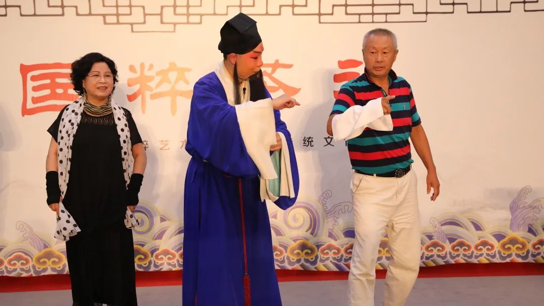 《桑园会》演出后,青年演员张颖超对剧中经典念白和程式化动作进行示范讲解,老同志们纷纷登台尝试,深入体验戏曲魅力。最后,在老同志们的热切期待中,国家一级演员王洪玲、张树群压轴出场,联袂登台献艺,演唱了《双错遗恨》《大登殿》等经典唱段,唱腔慷慨激越,酣畅淋漓,观众报以阵阵喝彩。