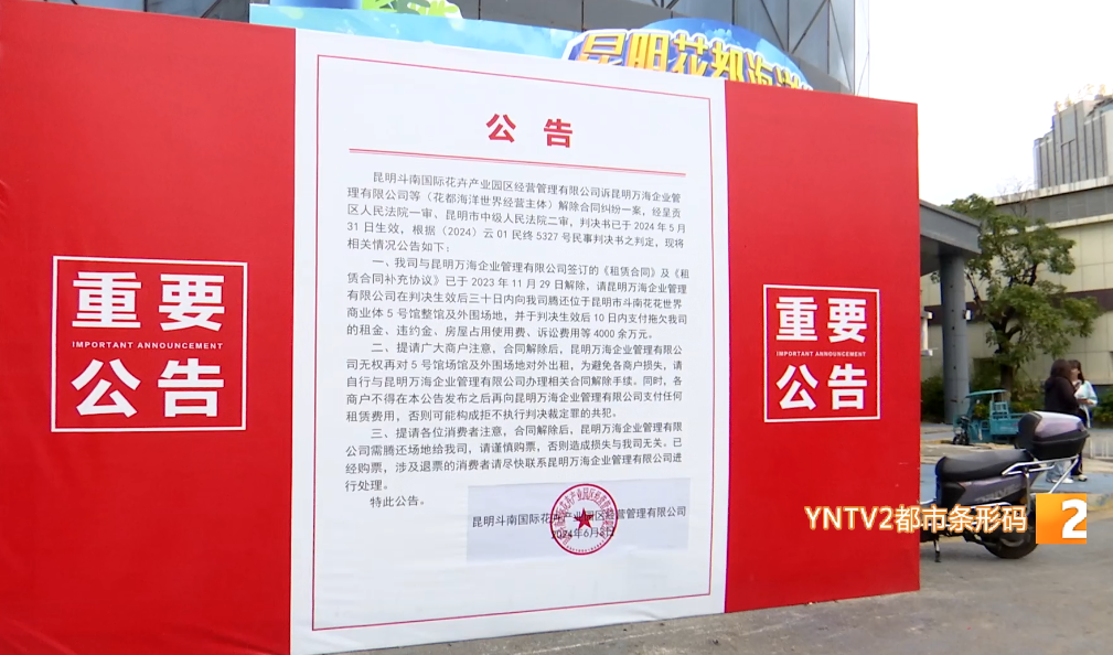 昆明斗南国际花卉产业园区经营管理有限公司招商商管部负责人李娜说:“花都海洋世界作为我们打造的经营业态之一,给了长达5年的免租期,同时还支持了近800万元的投资。在他们交租困难时,我们协调各相关金融机构帮缓解贷款压力,同时也积极商讨关于租金延付的各项政策,以缓解企业面临的压力,但租金交付事宜始终无实质性进展。迫于无奈,我们才通过法律途径与昆明万海企业管理有限公司解除合同关系。”