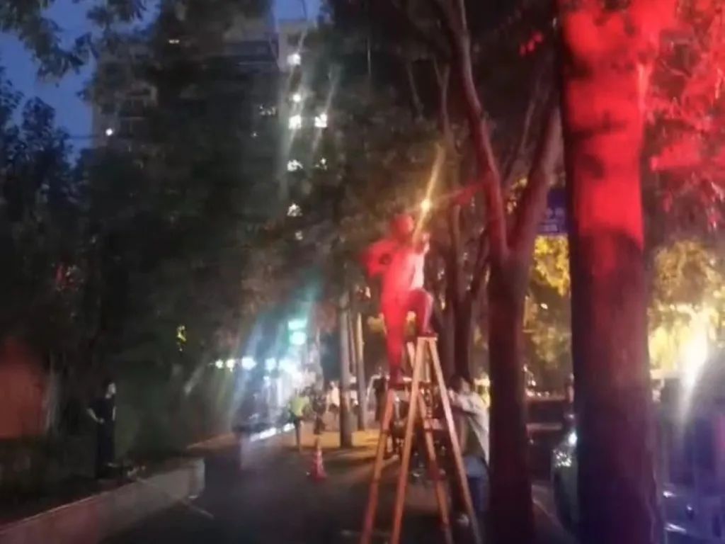 接到诉求后,农光东里社区立即向街道反映,劲松街道办事处副主任李军带领相关工作人员第一时间到位参与处置。考虑到着火处靠近居民区,沿路又不断有行人经过,工作人员一边疏散过往车辆及行人,防止燃烧物掉落伤到行人,一边协调供电局、绿化队等多部门联合处置,将可能触碰电线周围的树枝修剪、去除。经过1个小时的紧急处理,经检查险情已全部排除后,各方才放心离开。