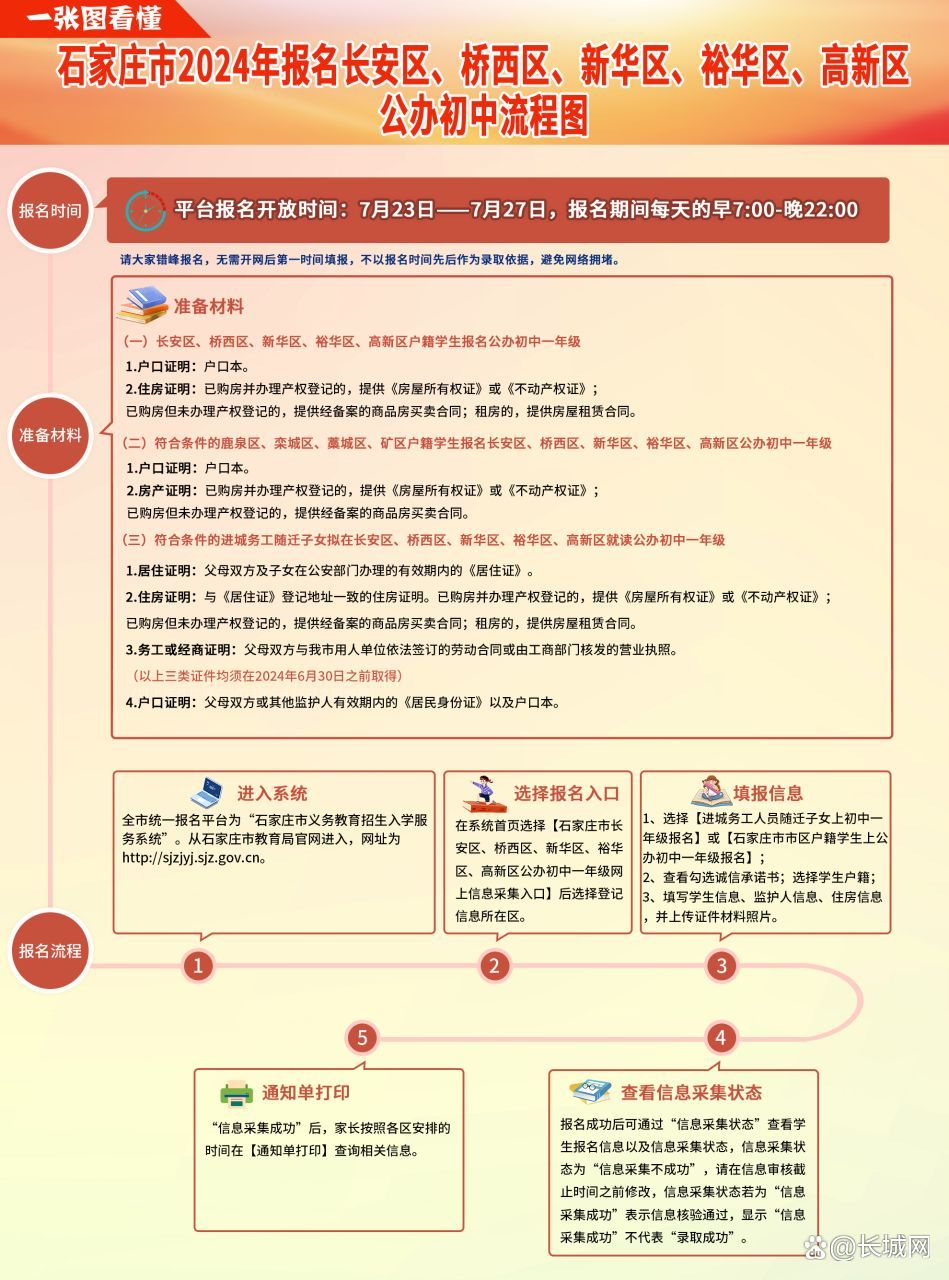今天,记者从石家庄市教育局获悉,按照《石家庄市2024年义务教育招生入学工作实施方案》文件要求,根据国家“高效办成一件事”和开展义务教育阳光招生专项行动有关要求,2024年石家庄市全面推行招生平台一站式招生,实现网上报名、材料审核和招生录取一网通办全覆盖。长安区、桥西区、新华区、裕华区、高新区公办初中报名工作将于7月23日—7月27日进行。在此,石家庄市教育局发出七条温馨提示。