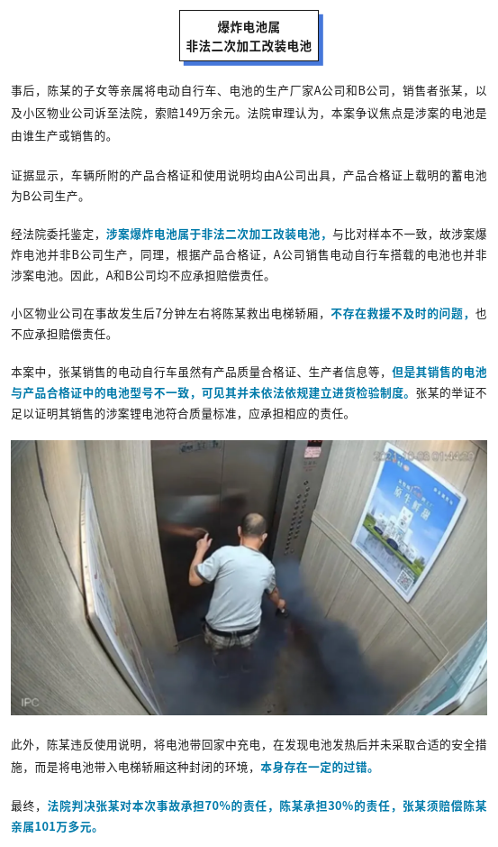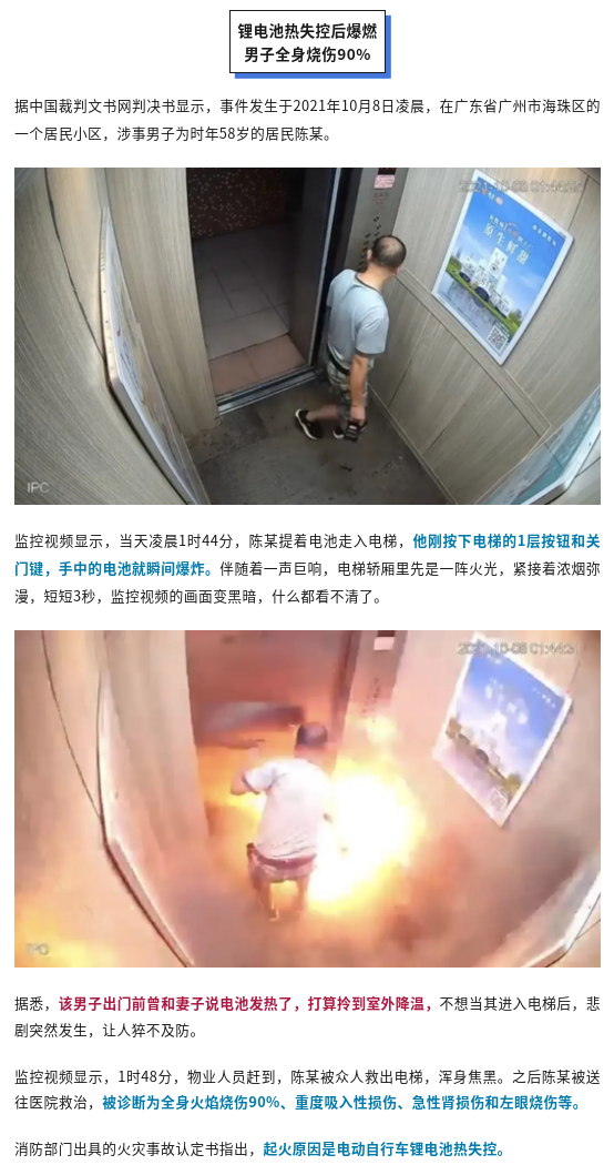 近日,一段电动自行车电池在电梯内爆炸的视频广为流传,给不少网友上了一堂“警示课”。据了解,这起事件发生于2021年的广州市,涉事男子当时被严重烧伤,虽然经过医治,但26天后仍不幸去世。经鉴定,爆炸电池属于非法二次加工改装电池,死者家属事后获赔101万多元。