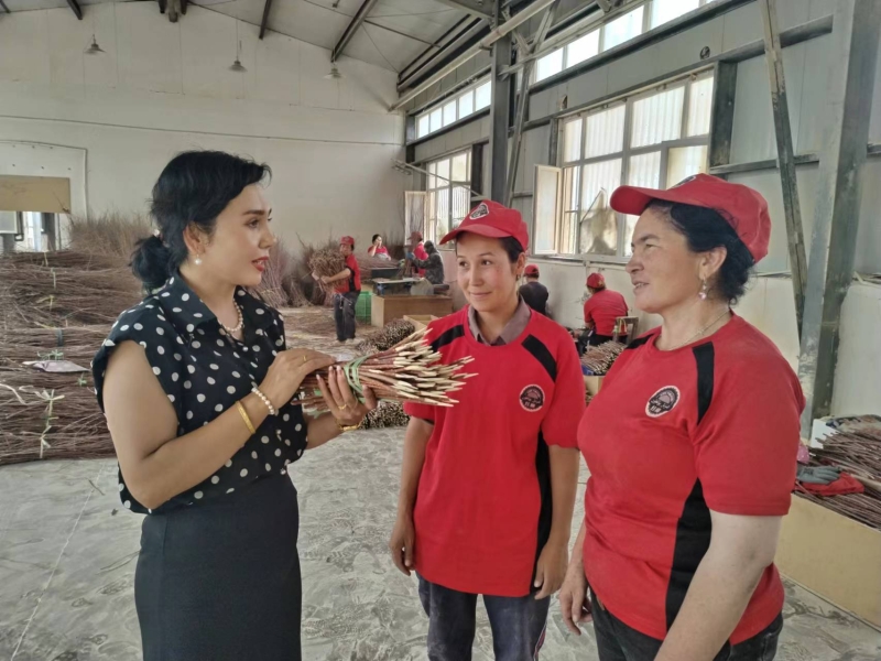 令阿扎提古丽意想不到的是,她的红柳烤肉签子一经推出便迅速赢得了市场的青睐。来自各地的订单如同潮水般涌来,不仅为合作社带来了可观的经济效益,更为当地群众提供了足不出村就业的机会。“家里离这里很近,上下班很方便,还能学到技术,收入稳定。现在我和老公都有工资,生活越过越好了。”来自多鲁镇加朗艾日克村的员工皮尔多斯·拜克尔,一边熟练地削尖手中的红柳枝,一边说道。