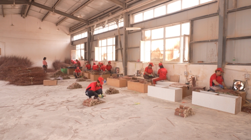 八年前,阿扎提古丽凭借敏锐的市场洞察力,发现了红柳签子在烧烤市场中的巨大潜力。于是,她注册成立了洛浦县红柳农产品专业合作社,成为了村里第一家加工合作社。她的行动得到了村委会的大力支持,于是她建成了占地900多平方米的红柳农产品专业合作社,倾尽所有积蓄,种植1600亩红柳,引进了生产设备,开始了红柳签子的加工生产之路。