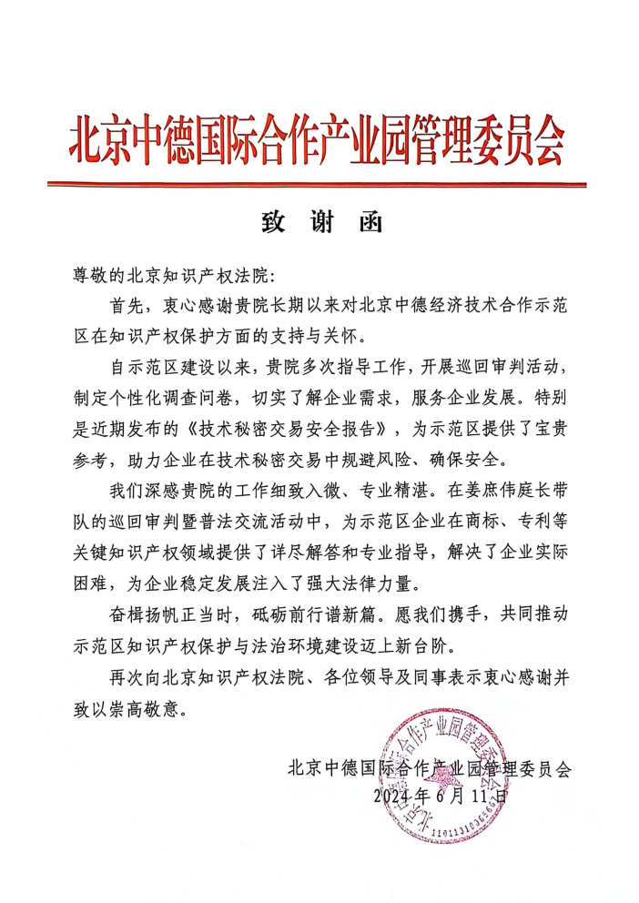 此次活动后,北京中德国际合作产业园管委会特别向北京知识产权法院发函致谢,感谢北京知识产权法院长期以来对园区在知识产权保护方面的支持。