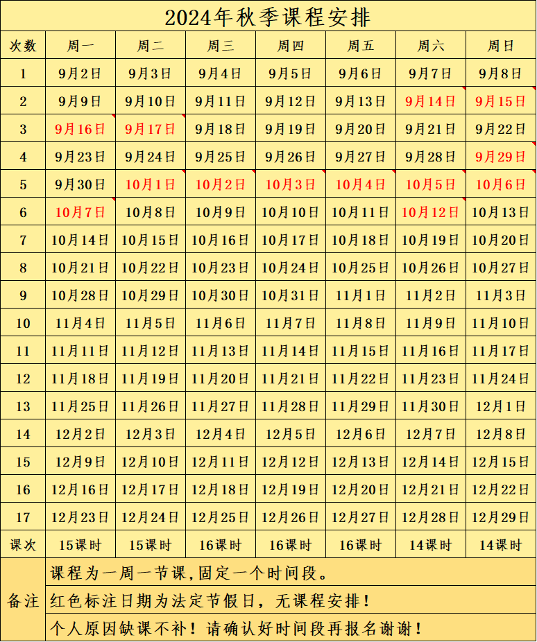 ●请确定好时间再报名,报名后请按照所报时间段来上课。