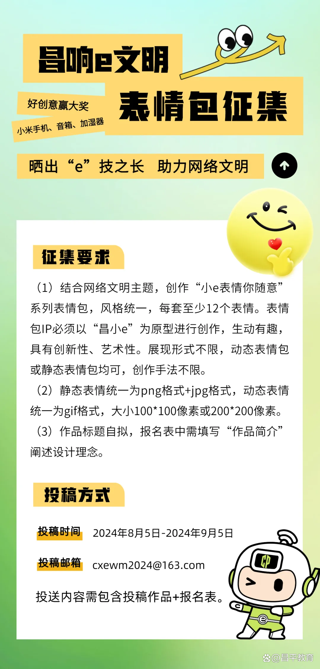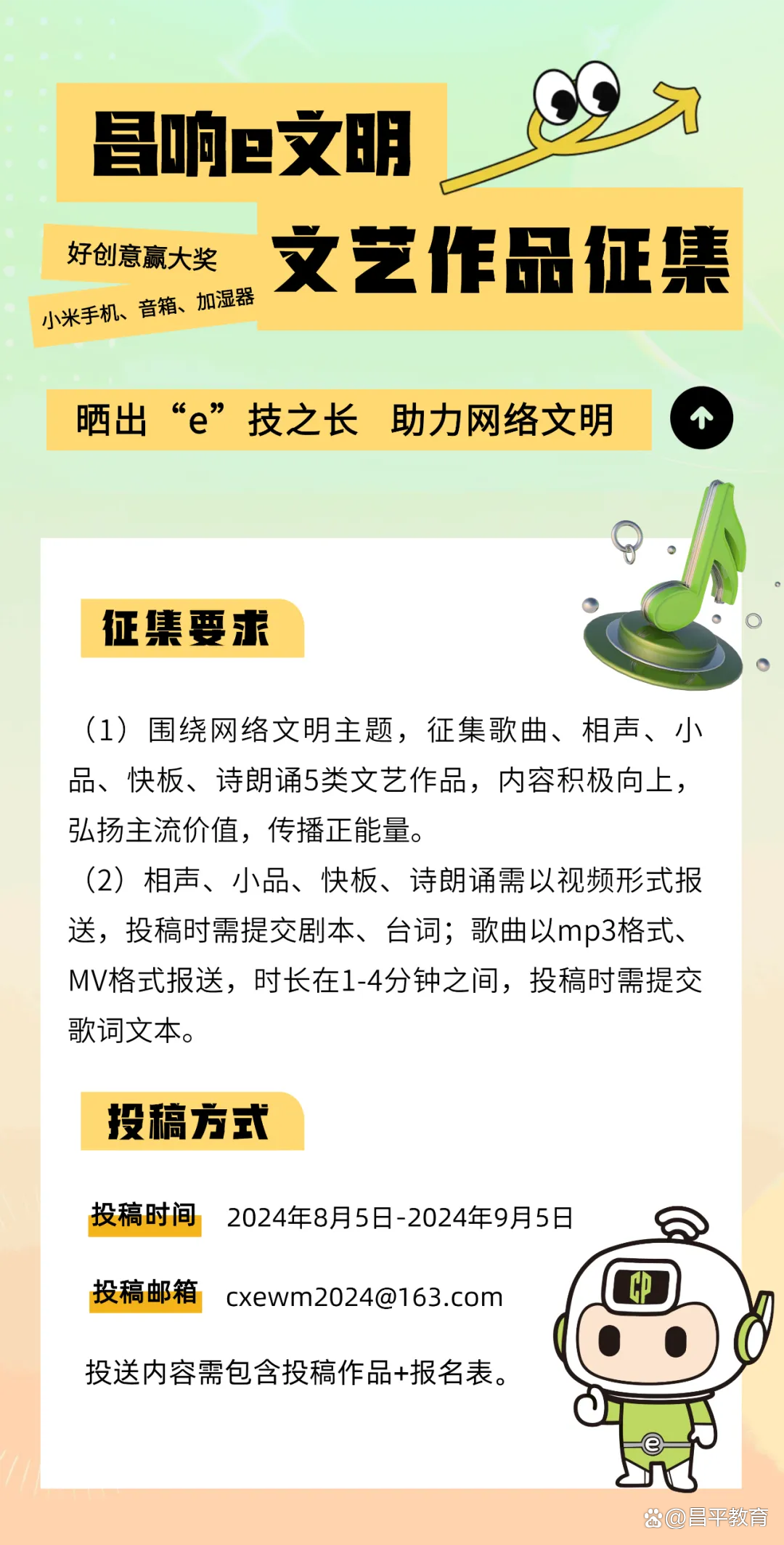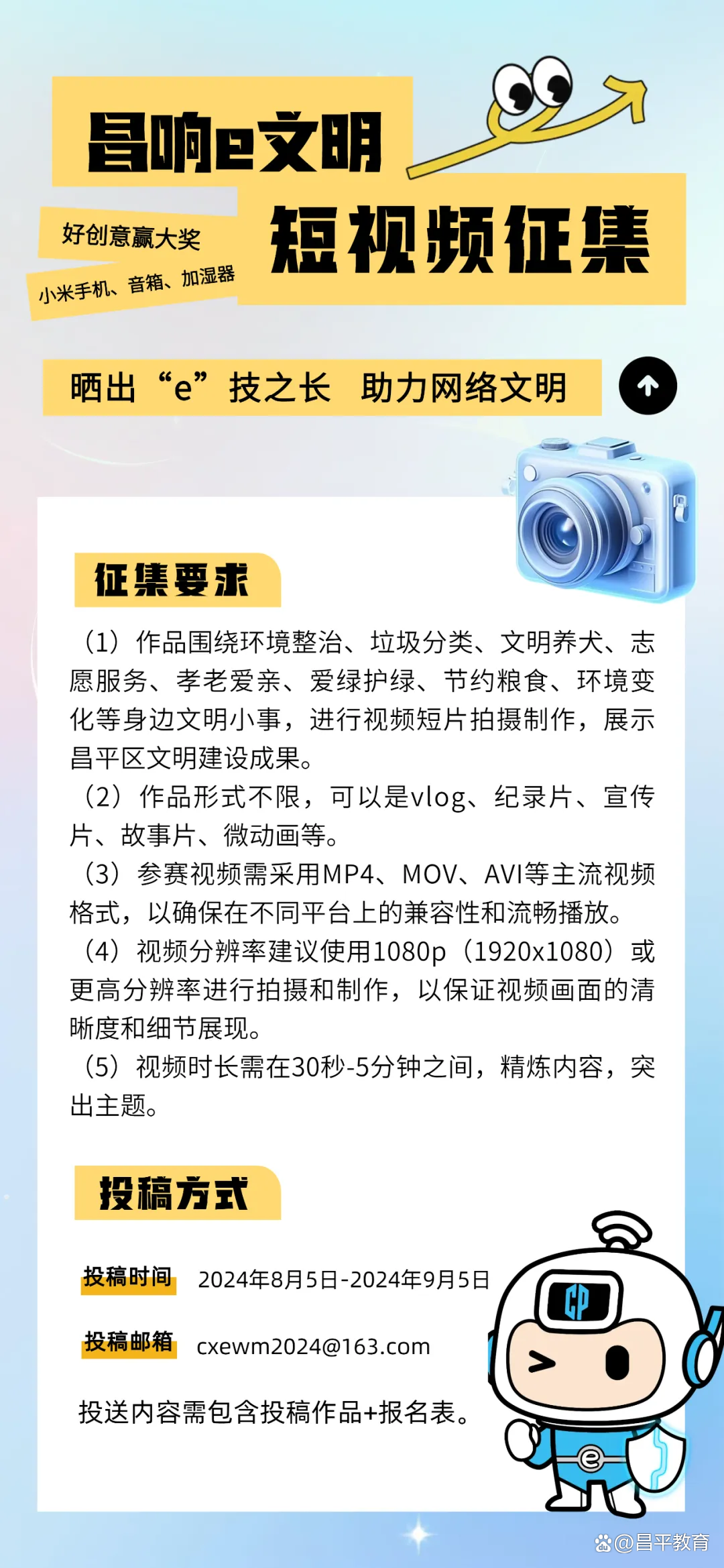 为进一步做好网络文明传播工作,号召更多昌平网民共同维护清朗网络空间,昌平区委网信办联合北青社区报昌平分社共同开展“‘昌响e文明’——晒出你的e技之长”线上征集活动,2024年8月5日至9月5日,邀请广大网友一起创作优秀网络作品,共创美好精神家园!
