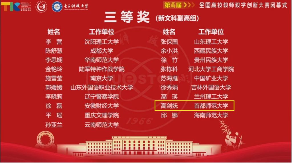 7月28日至7月31日,第四届全国高校教师教学创新大赛全国现场赛在电子科技大学隆重举办。经过前期精心准备和现场激烈角逐,首都师范大学外国语学院高剑妩教师团队(马爽、杨波)在新文科副高组获得三等奖。这是首都师范大学教师第三次登上全国教学竞赛舞台。