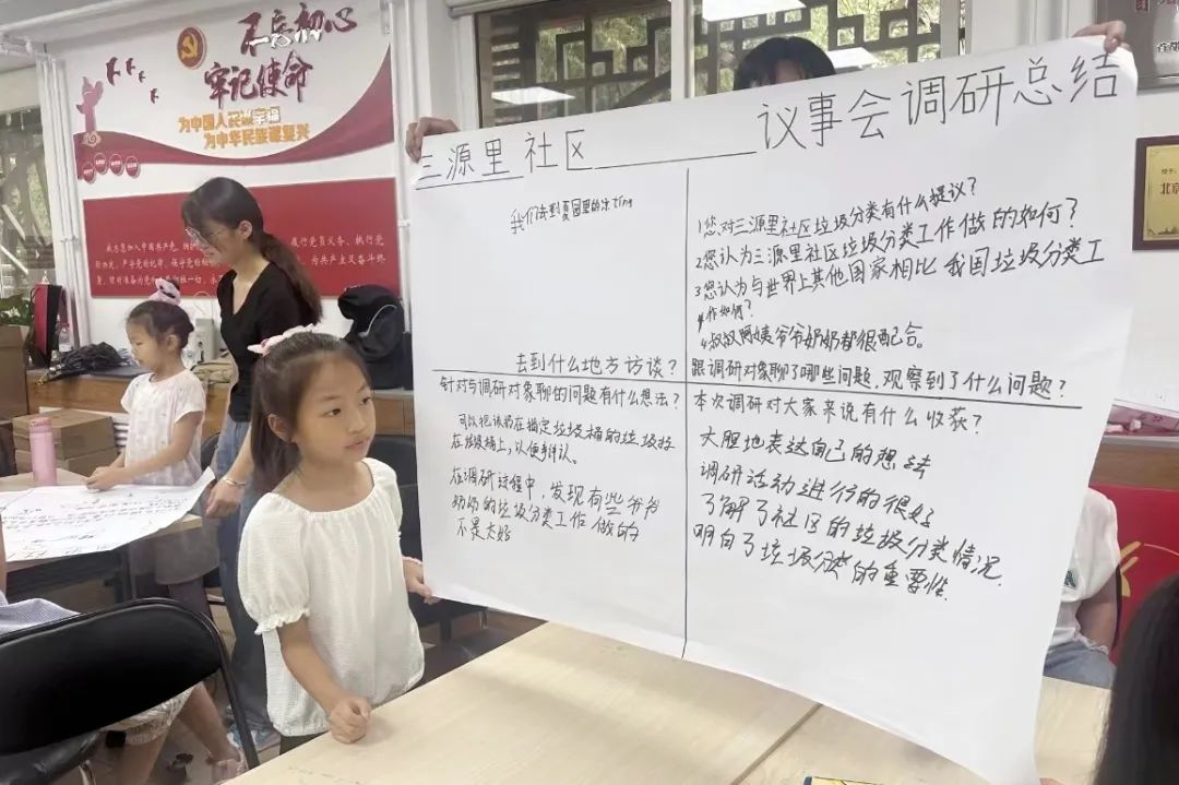 这个夏天,三源里社区通过创新辅导、小组讨论等方式,为社区儿童搭建议事阵地,将“儿童观察团”融入到儿童议事会中,引导儿童对社区建设充分表达自身想法和实际需求。在社区工作人员的带领下,孩子们走进小区实地调研,用心记录,并与阅历丰富、有议事经验的工作人员交流座谈,完善想法,最后带着调研结果回到议事厅,与小组员们一起头脑风暴,集思广益。孩子们通过在社区边走边看边问边想,不少有趣的想法在你一言我一语中渐渐成形:“我希望小区里面可以有个秋千、希望以后小区里多种点花、小区的儿童游乐设施太少了,建个游乐场吧……”从反对家庭暴力的法律知识普及,到校园欺凌的预防策略;从构建安全和谐的社区环境,到提升自我保护的居家安全技能,再到倡导文明新风,成为家庭教育的小小宣传员,孩子们的每一个提议都充满了童真与责任。三源里社区儿童观察团不仅让“小主人翁”收获了快乐和成长,而且激发了参与社区建设的积极性,为社区发展贡献新思路。
