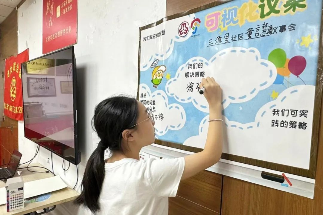 据三源里社区党委书记徐劼介绍,“为了更好聆听童声,创造儿童自由表达平台,特别是在假期或周末鼓励儿童参与社区事务,促进儿童友好社区建设,我们社区专门成立了儿童议事会,通过不断创新儿童议事会体系,让儿童更好地参与社区基层治理,逐步形成党政主导、部门协作、社会支持、人人参与的儿童参与社区治理格局,助力儿童友好城市建设。”