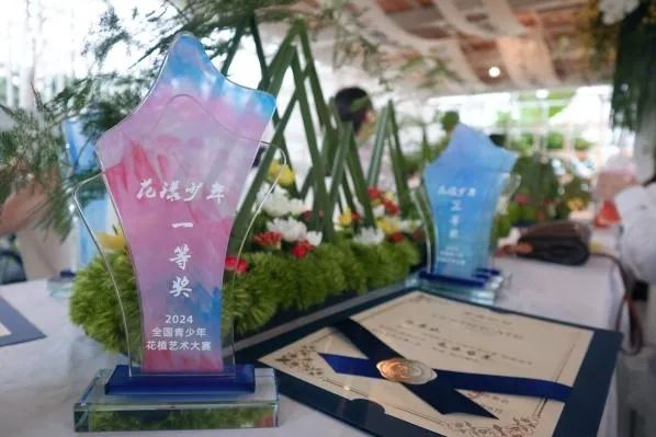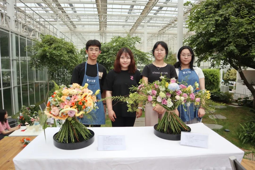 3名学生分别以《花漾盛景》《繁花织艺》《素秋》为主题设计制作了参赛作品;师生团队以花卉植物为材料设计制作了《花间秘境》作品。最终,荣获青少年个人组赛道二等奖2个、三等奖1个以及师生团队组赛道一等奖。