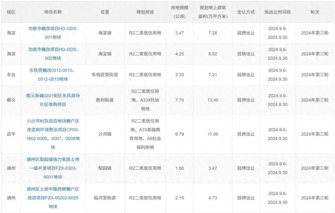 今年2月和6月,北京分别公布了今年第一批和第二批拟供地清单,各涉及23宗用地,这些地块大部分也已在今年前几个月陆续供应入市。记者注意到,第三批的供地数量较少,只有7宗,土地面积约29公顷,建筑规模约56万平方米。但供应时间很紧凑,7个项目都将于本月底前供应。