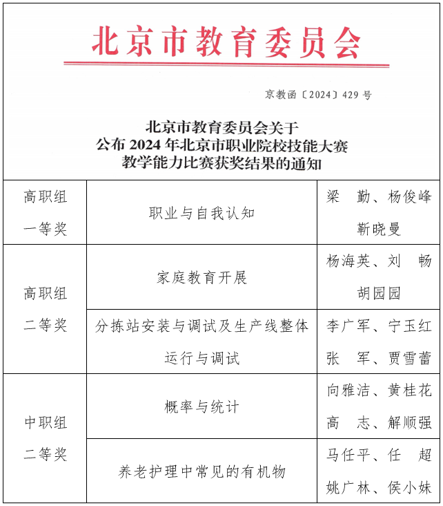 在刚刚公布的2024年北京市职业院校技能大赛教学能力比赛获奖结果中,学院派出的5支代表队分别获得一等奖1项,二等奖4项。